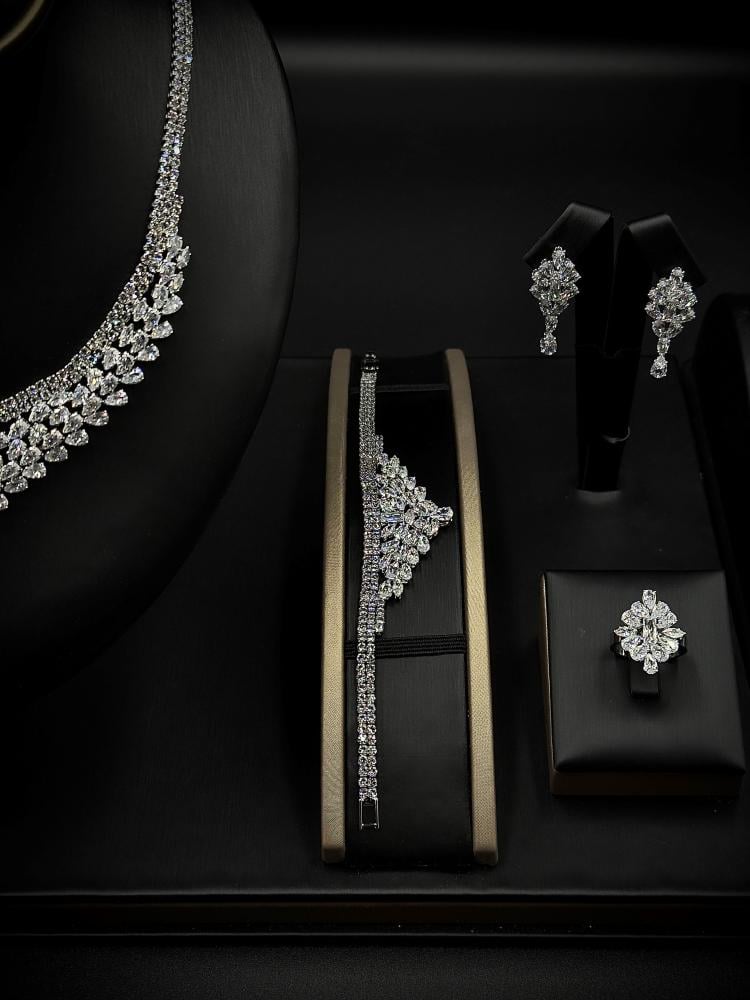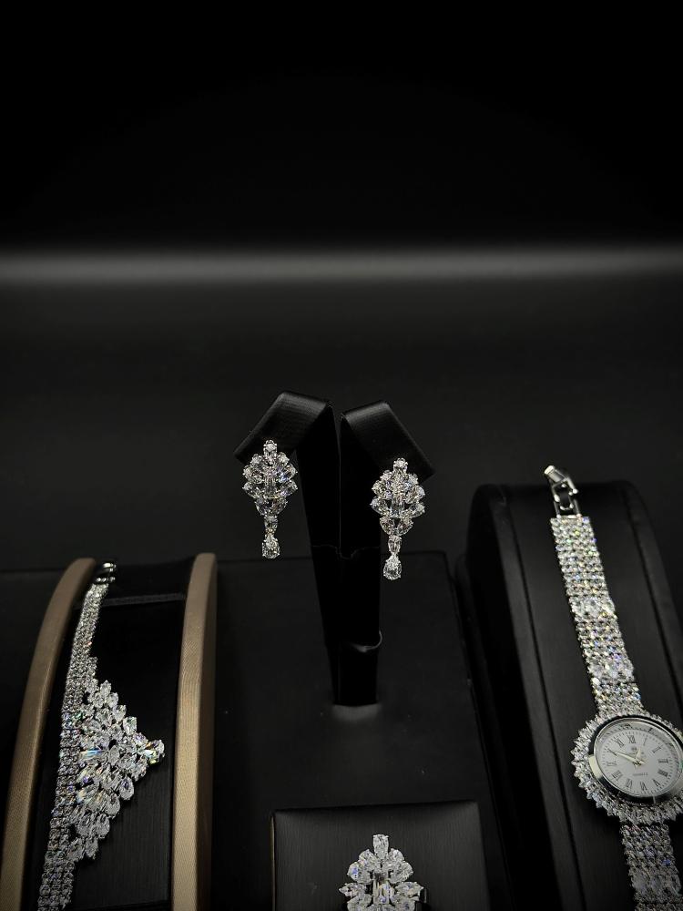 - الأقراط: انسيابية ومطرّزة بأحجار الزركون بتصميم يتماشى مع تفاصيل العقد، تمنح الوجه إشراقة متألقة.