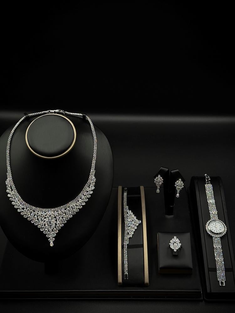 تميزي بإطلالة راقية لا تُنسى مع طقم الاكسسوار الكامل الذي يجمع بين الفخامة الكلاسيكية واللمسة العصرية. تصميم متقن بأحجار الزركون الفاخر المتناثرة بانسيابية لتشكل لوحة فنية تنبض بالبريق. يشمل الطقم ساعة فاخرة لتكتمل أناقتك بتناسق تام.