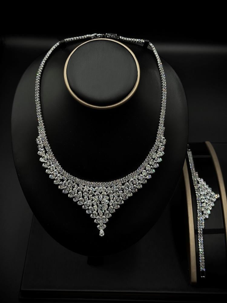 - العقد: تصميم فاخر على شكل طوق يغمر الرقبة بأحجار زركون مشرقة ومتدرجة الأحجام، تنتهي بتصميم مركزي مميز على شكل زهرة يتدلّى منها حجر دمعة لامع.