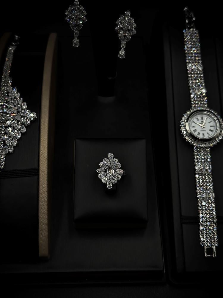 - الساعة: ساعة عملية وفخمة، مرصعة بالكامل بأحجار الزركون اللامعة، ومينا بتصميم راقٍ يناسب المناسبات الكبيرة والسهرات.
