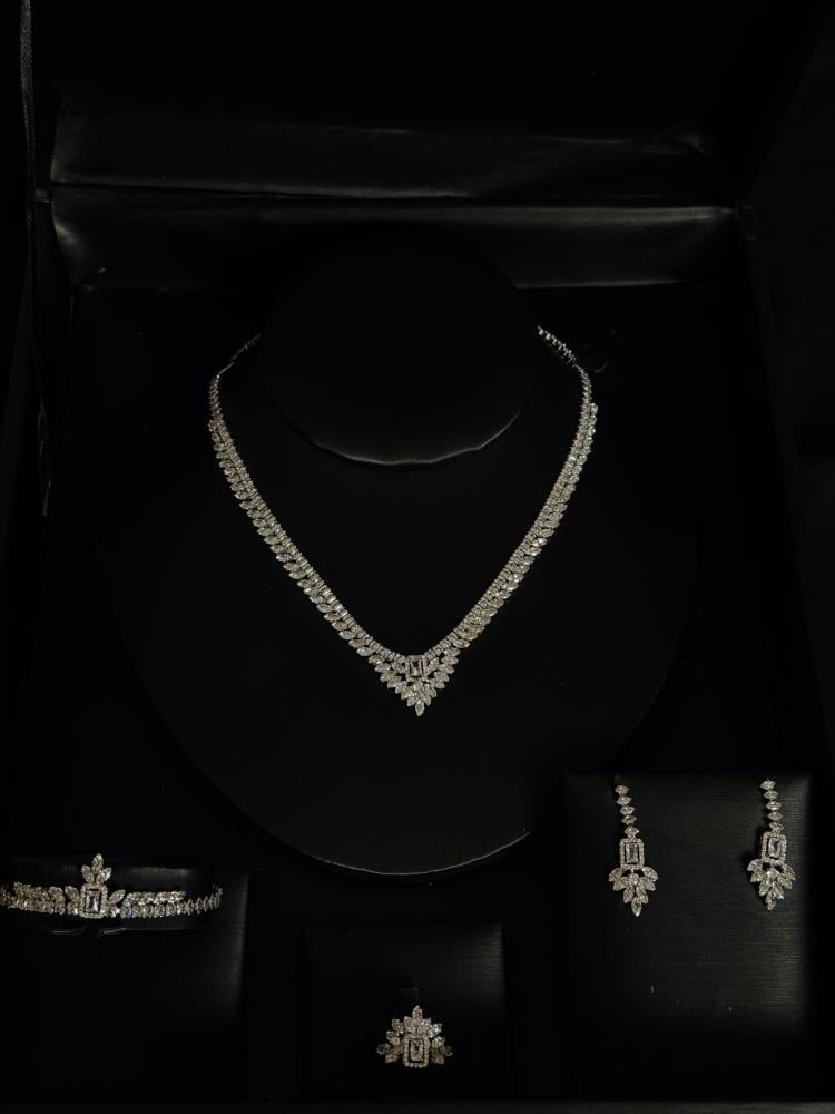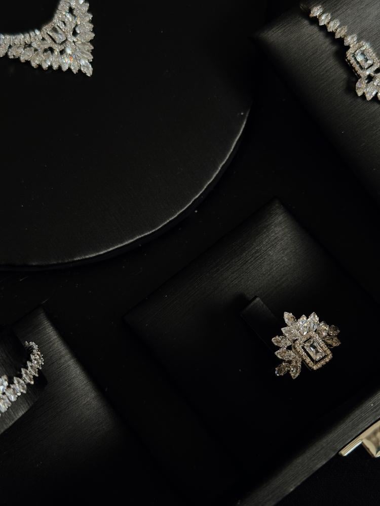 - خاتم: يتميز بقطعة مركزية فاخرة تحاكي تصميم القلادة، ليكمل الطقم بانسجام وأناقة.