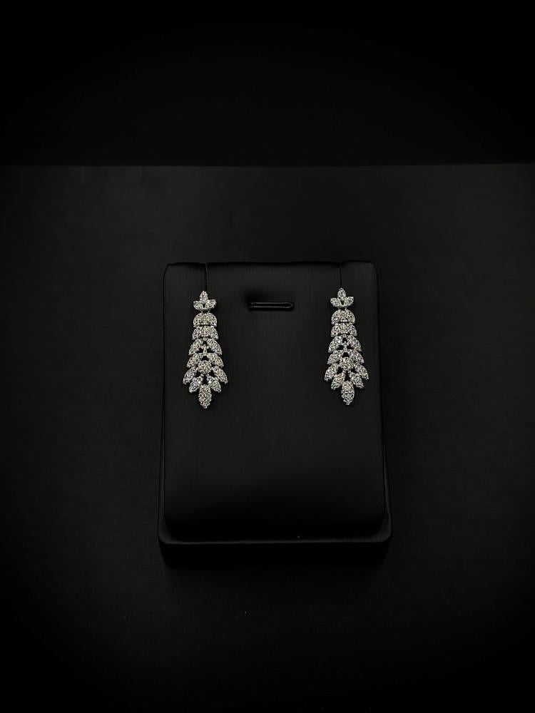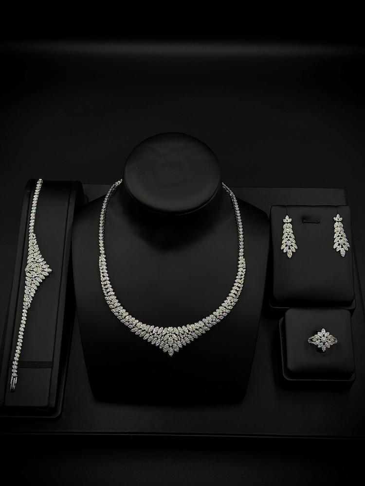 • عقد مزخرف بتصميم فاخر مرصع بأحجار الزركون عالية النقاء بأشكال متنوعة (قطع كمثرى، مستطيل، ومستدير)، يتدلّى بتوازن راقٍ يلفت الأنظار.
