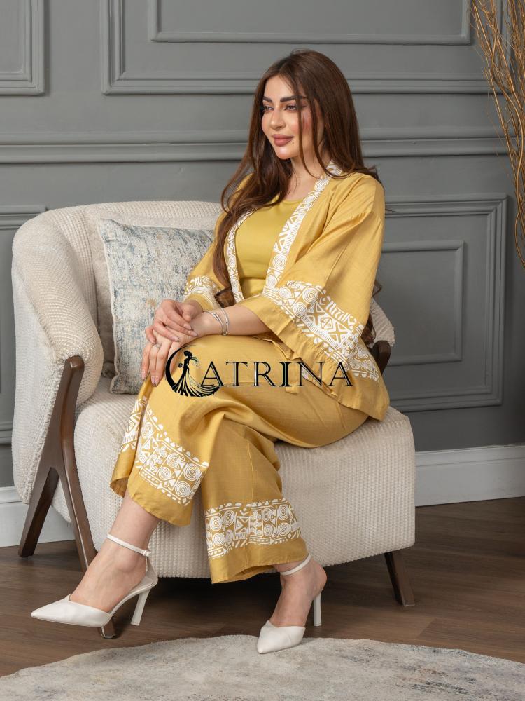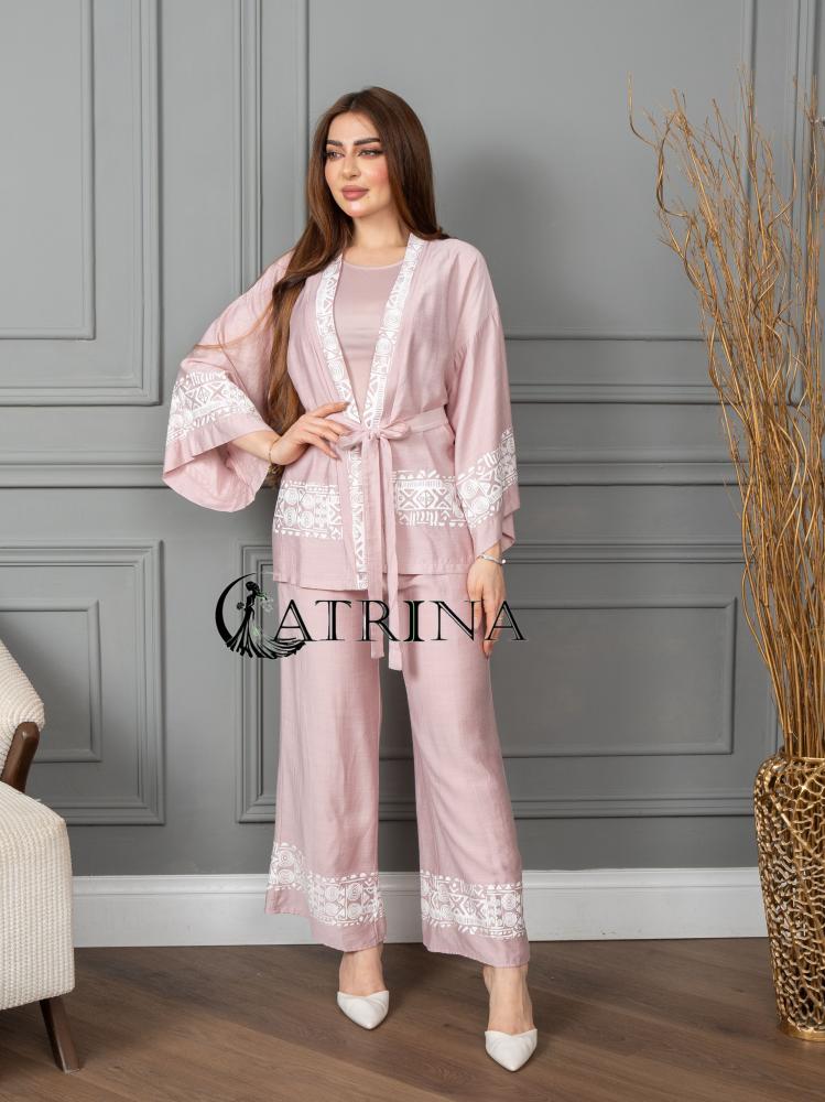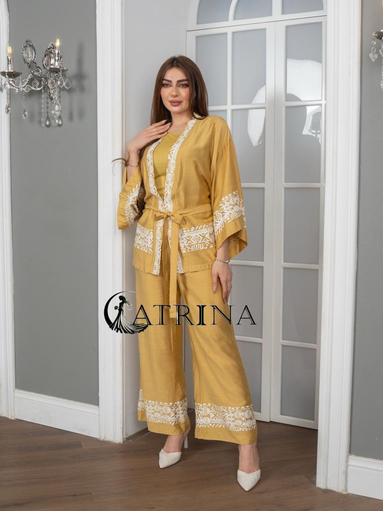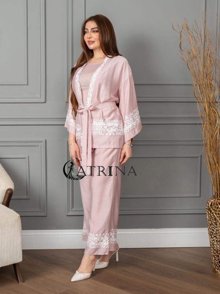 طقم بنطلون ثلاث قطع نسائي يتميز بقطعه راقيه من الداخل بجاكيت راقي وتطريز كمبيوتر حول الاكمامو يضاف اليه قطعه بنطلون فاخره تضيف له لمسه انيقه.