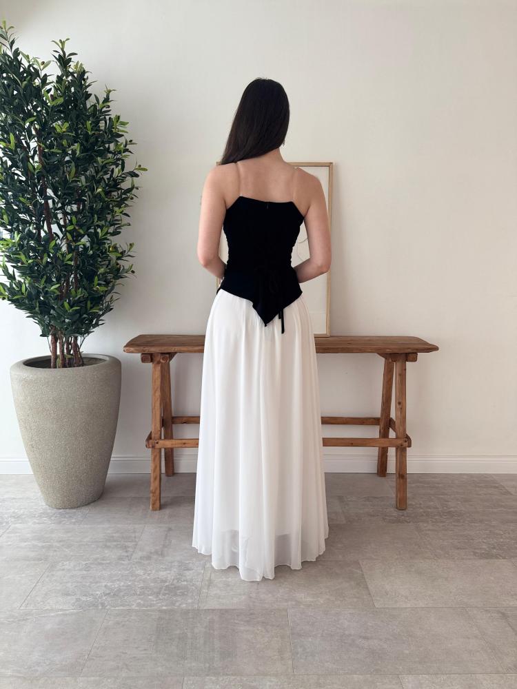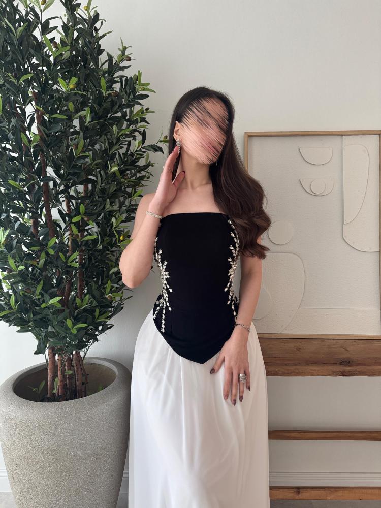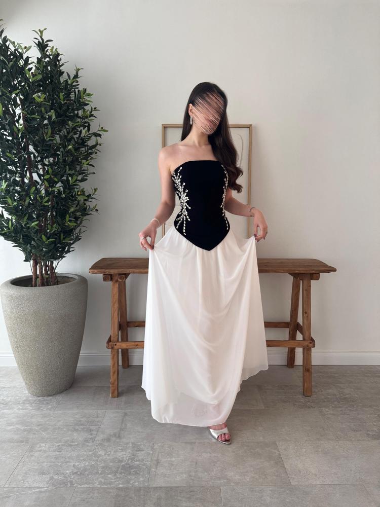 فستان أبيض وأسود بكورسيه مطرز وتنورة انسيابية