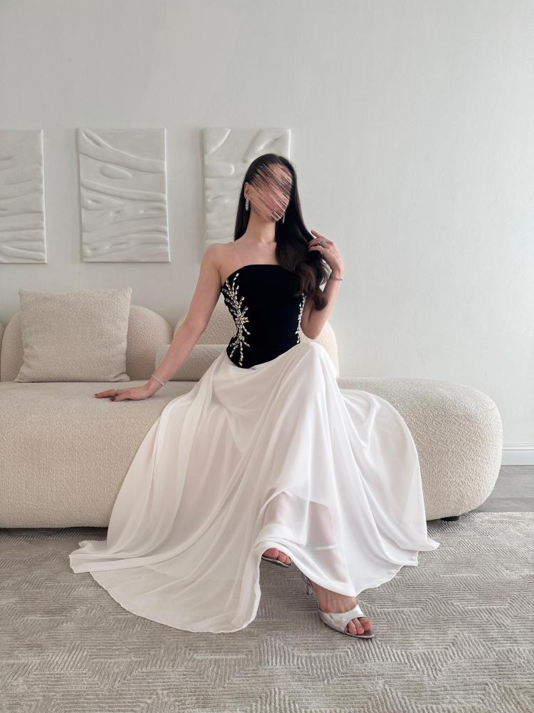 يجمع الفستان بين التباين الكلاسيكي للأبيض والأسود والتطريز اللامع، ليمنحك حضوراً أنيقاً وملفتاً في أي مناسبة.