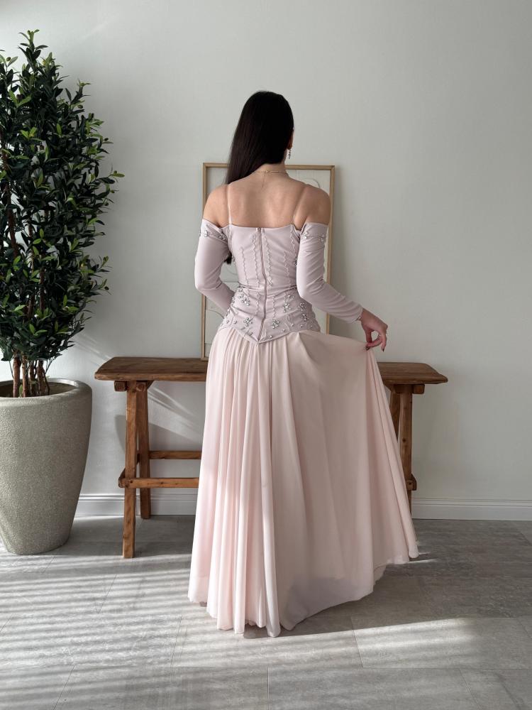 ✨ فستان الباستيل الملكي بأكتاف ساقطة وتطريز يدوي