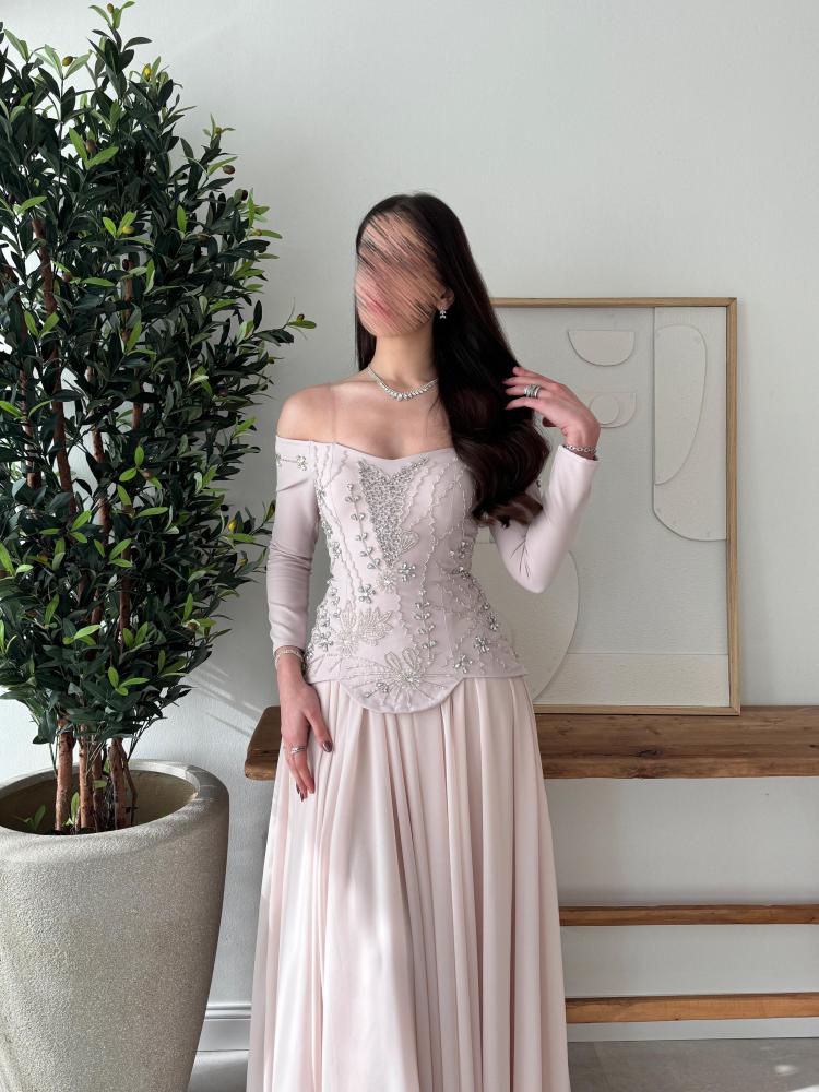 التفاصيل المطرزة اليدوية مع لمسة الأكتاف الساقطة تمنحك إطلالة راقية وناعمة في آن واحد، مثالية لكل امرأة تبحث عن التميز والرقي.