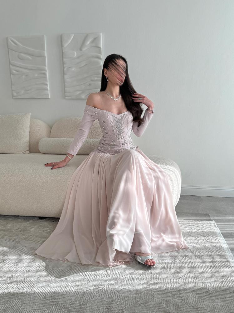 فستان سهرة أنثوي راقٍ بلون وردي باستيل ناعم، بتصميم يجمع بين البساطة والفخامة.