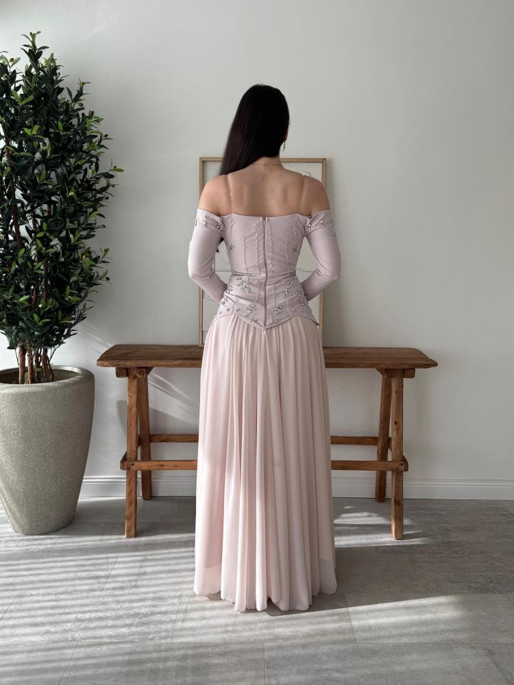 - الخامة: شيفون فاخر + كورسيه مطرز يدوياً.