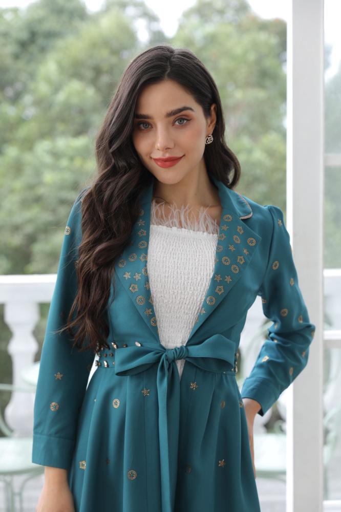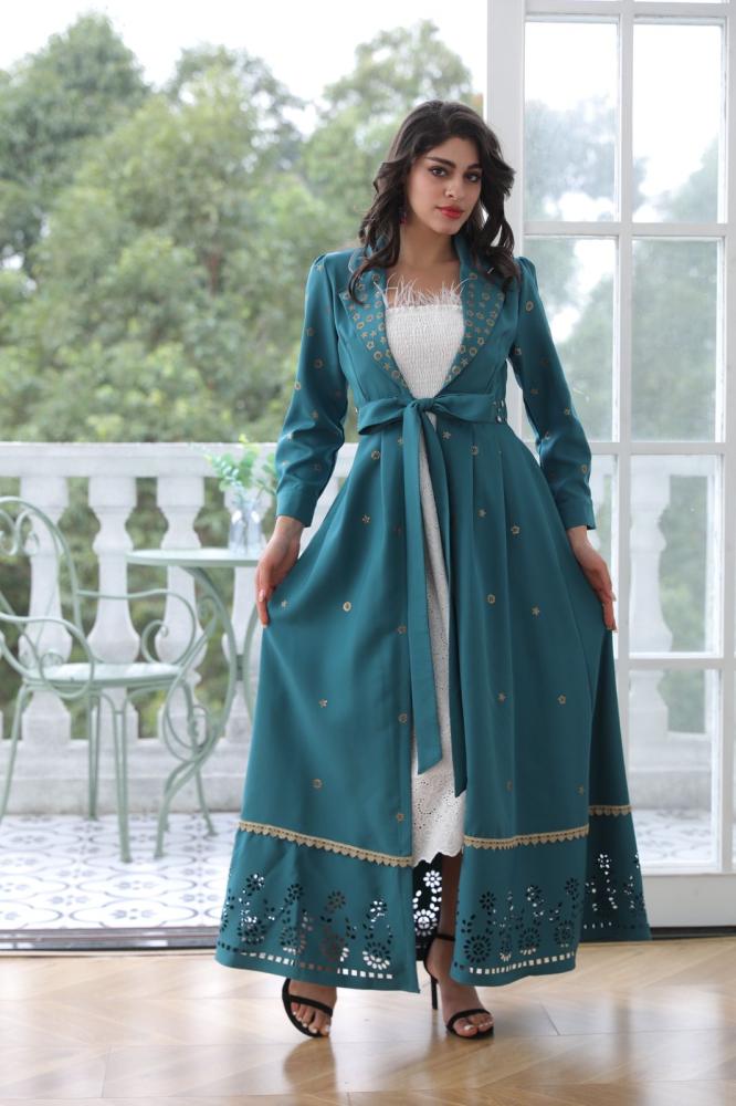 فستان انيق قطعتين لونين ؛ البلوزة الداخلية البيضاء المزينة بياقة ناعمة من الريش لإضفاء لمسة أنثوية مميزة، والقطعة الخارجي الطويل باللون الأخضر الملكي مع تطريزات ذهبية راقية.