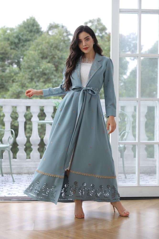 التفاصيل المثقبة والزخارف الهندسية على أطراف الفستان تضفي مزيجًا من العصرية والفخامة. كما يتميز بحزام أمامي مع ربطة أنيقة تضبط الخصر بإطلالة مميزة. مثالي للسهرات والمناسبات الخاصة، حيث يجمع بين الأناقة والراحة لتتألقي بإطلالة لا تُنسى."