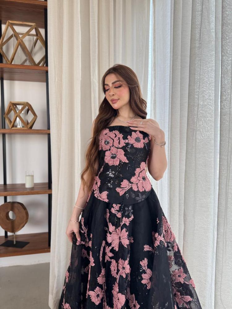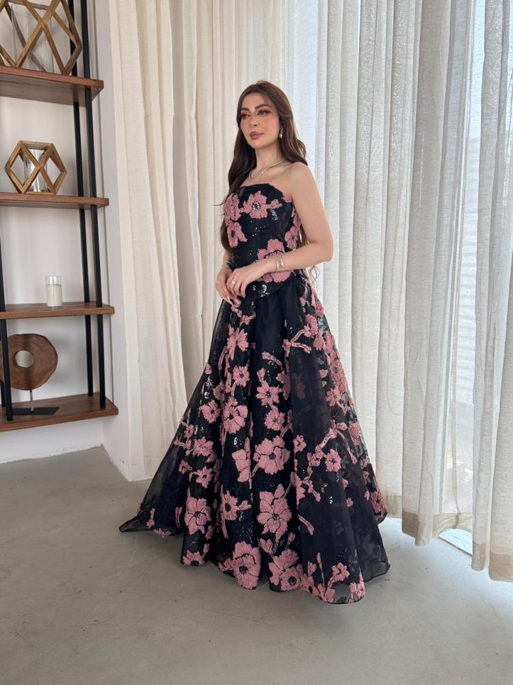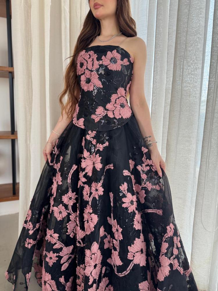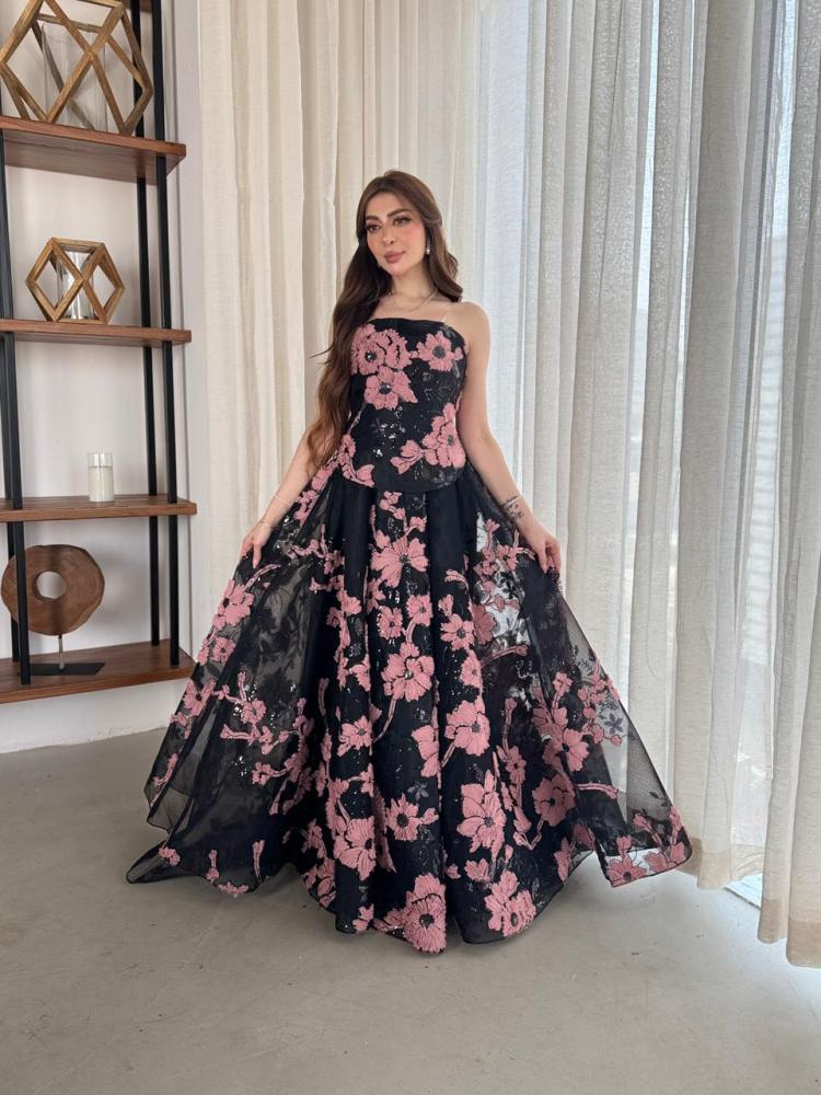 تميزي بإطلالة حالمة مع هذا الفستان الأسود الساحر، المصمم بقماش شفاف فاخر مطرّز بالكامل بزهور بارزة باللون الوردي لإطلالة أنثوية راقية. يتميز بقصّة سترابلس (بدون أكتاف) مع صدر ضيق يبرز جمال القوام، فيما تنسدل التنورة الواسعة بقصّة A-Line تمنحك حركة انسيابية وأناقة ملكية. التطريزات الكثيفة بالزهور الوردية تضيف لمسة رومانسية مبهرة تجعله خيارًا مثاليًا للحفلات الفاخرة والمناسبات الخاصة.
