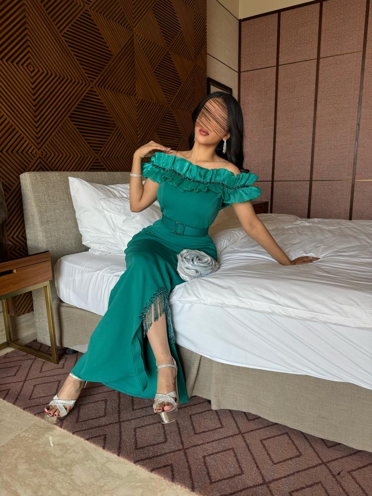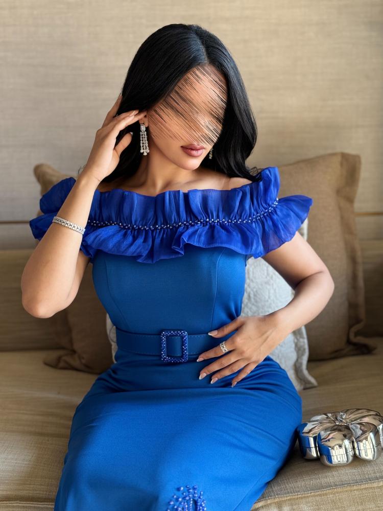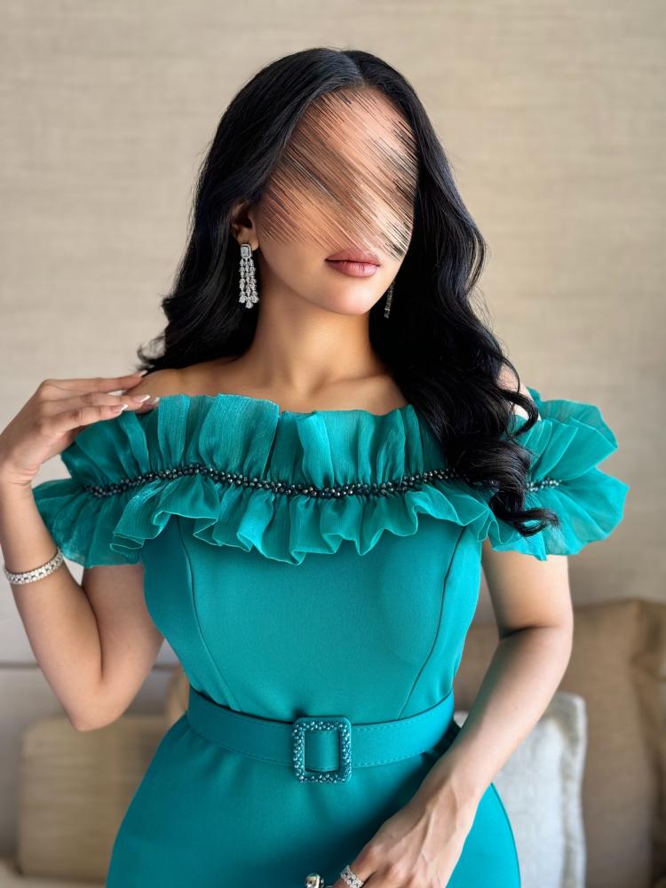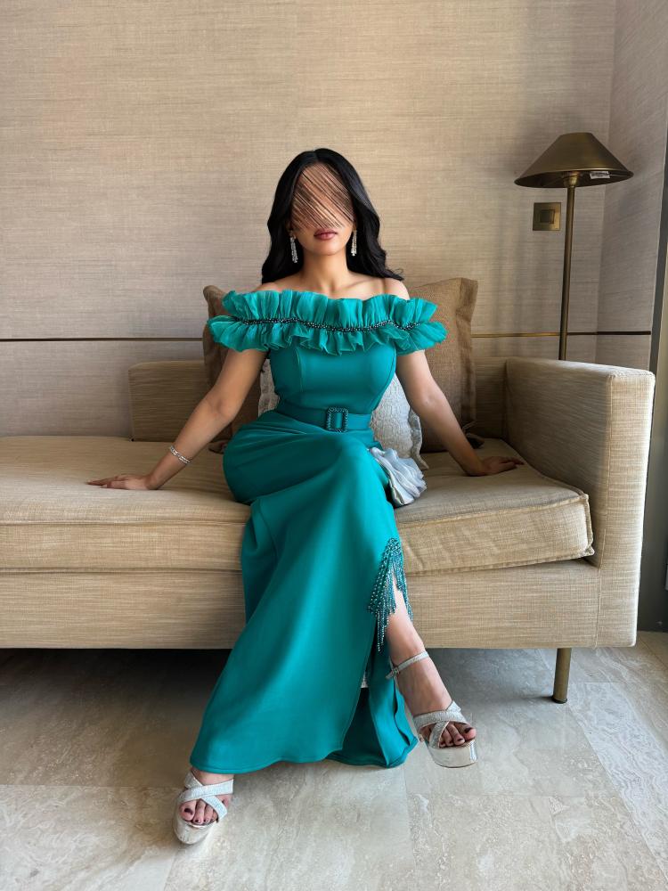 التطريز في الكتف والحزام الناعم جعل من الفستان جذاب وراقي .