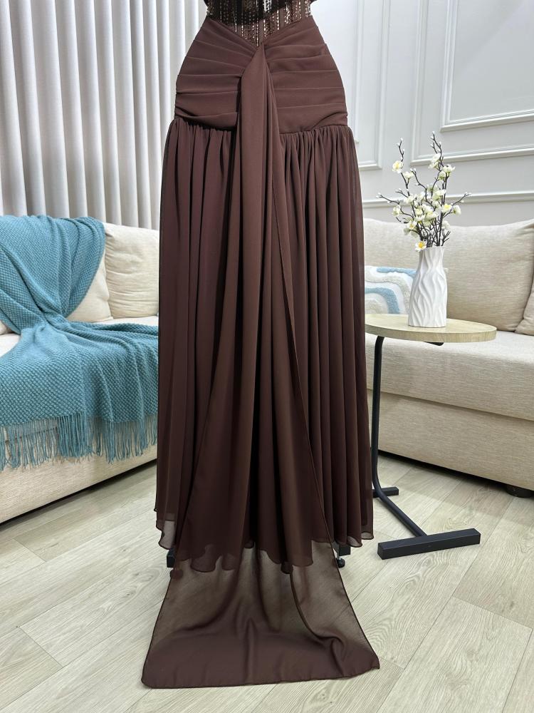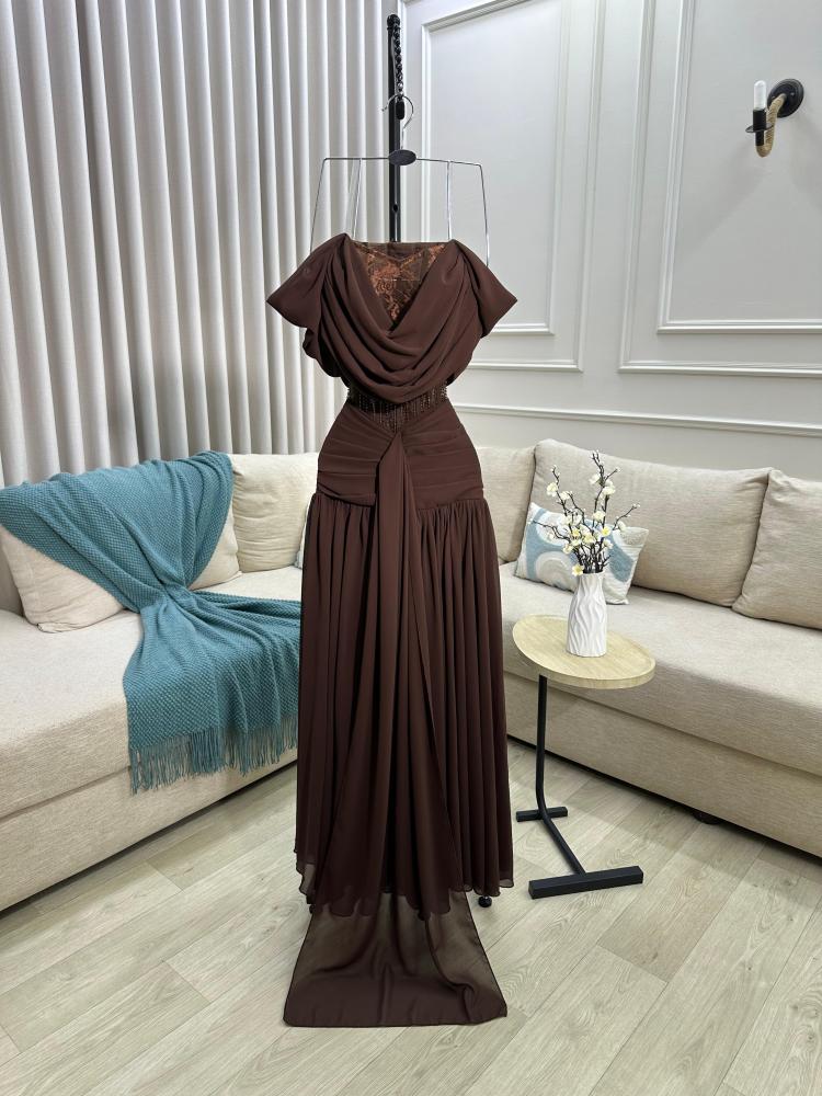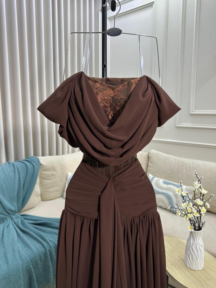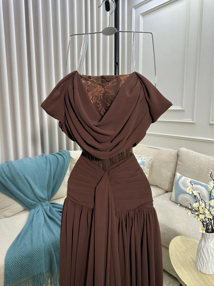 أبرزي أناقتك مع هذا الفستان البني الفخم المصمم بأسلوب يجمع بين الرقي والأنوثة. يتميز بصدر مطوي بشكل ناعم مع فتحة دانتيل شفافة تضفي لمسة راقية على الإطلالة. الخصر محدد بتفاصيل دقيقة وتطريز ناعم يعزز جمال القوام، بينما تنسدل التنورة الطويلة بانسيابية من قماش الشيفون الخفيف لتعطي حركة راقية وسحرية مع كل خطوة. تصميم الأكتاف المسقطة بأسلوب Draped يضيف لمسة درامية أنثوية تلفت الأنظار.