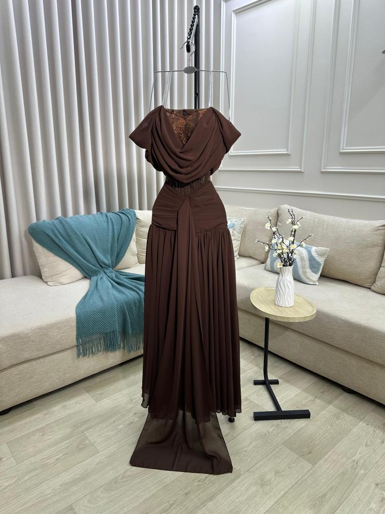 فستان سهرة بني أنيق بتصميم مطوي مع دانتيل فاخر