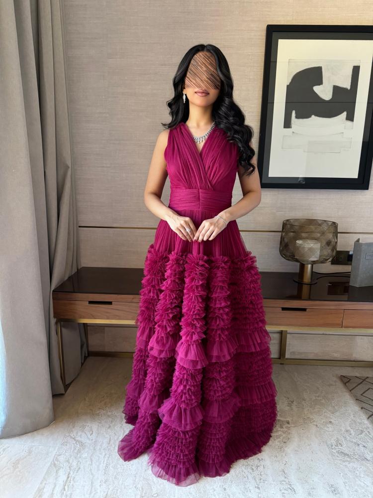أما التنورة فهي التحفة الفنية لهذا التصميم! حيث تأتي مزينة بطبقات غنية من الكشكش المتناسق المصنوع من التول الناعم، مما يمنح الفستان حجماً وحركة رائعة تضفي عليه لمسة درامية راقية مع كل خطوة.