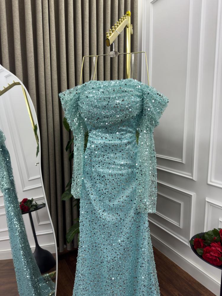 استمتعي بإطلالة تأسر الأنظار مع هذا الفستان الساحر باللون التيفاني الفاتح المشرق، الذي يضفي لمسة من الحيوية والأناقة الراقية في كل مناسبة. يتميز الفستان بتصميم عصري وأنيق، مع قصة ضيّقة تبرز جمال القوام وتنتهي بتنورة واسعة تمنحك حرية الحركة وأناقة لا مثيل لها.