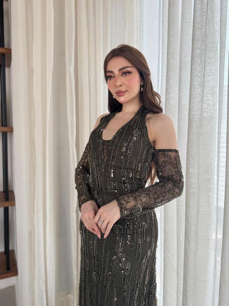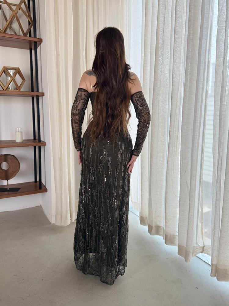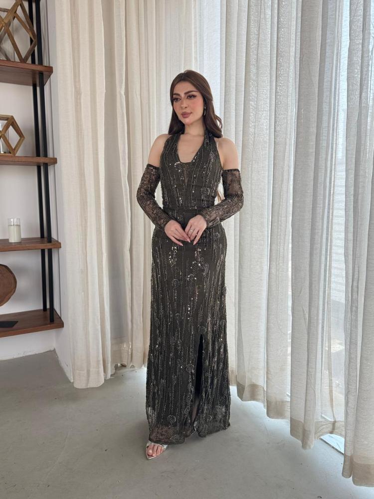 فستان سهرة زيتي مطرز مع قفازات دانتيل