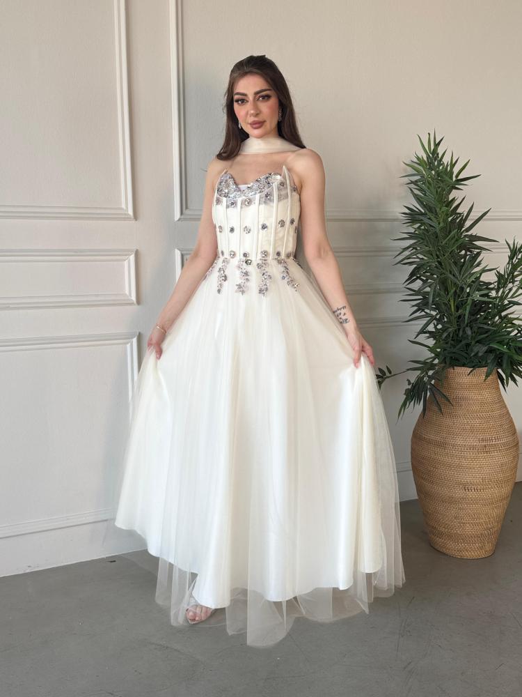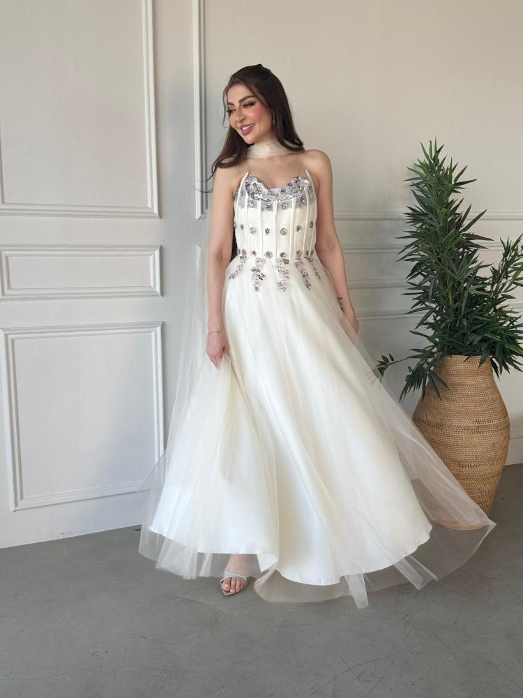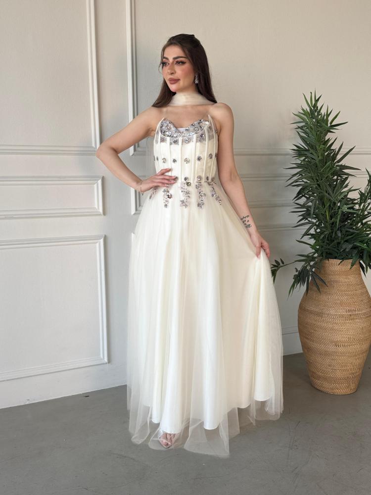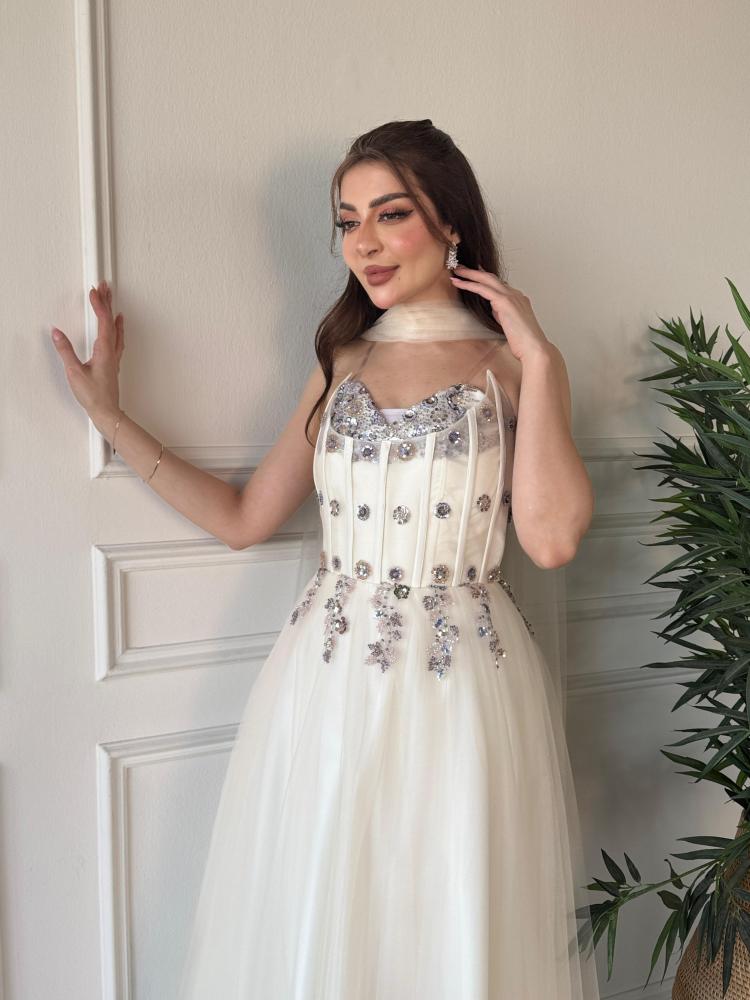 • التفاصيل: تطريز ترتر لامع على الصدر، كريستالات متفرقة، وشاح تول حول العنق.