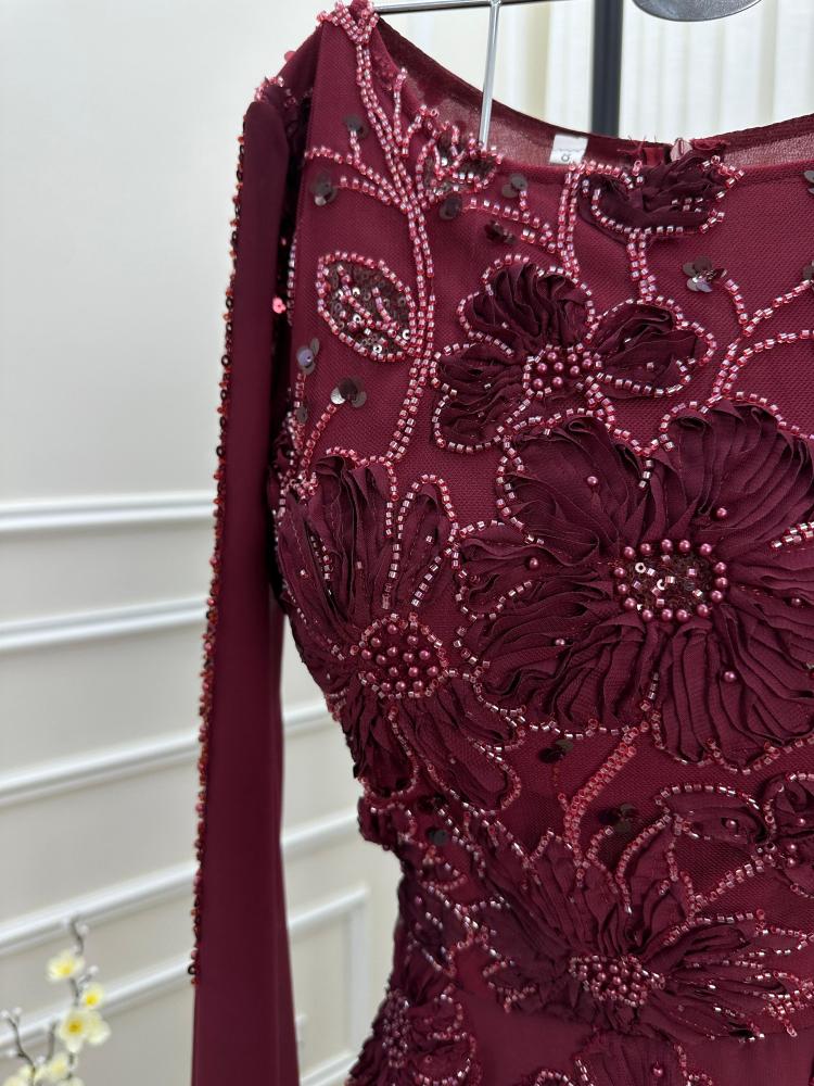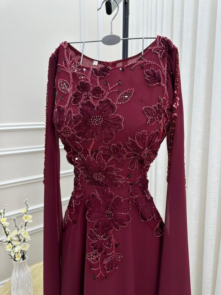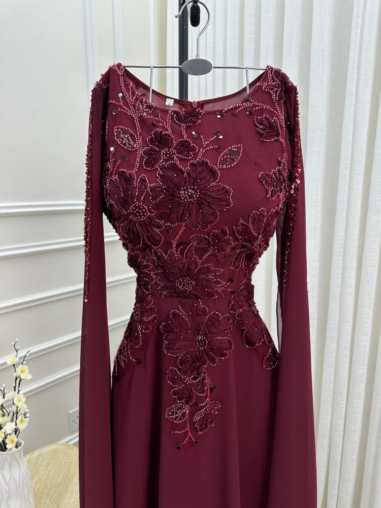 بتصميم راقٍ يجمع بين الأناقة والأنوثة. يتميز بتطريزات يدوية فاخرة على شكل ورود وأغصان متفرعة مزينة بالخرز اللامع، تضيف لمسة ملكية ساحرة. الأكمام الطويلة المنسدلة تعطي انسيابية وأناقة، بينما يحدد الخصر ليمنح قواماً ممشوقاً وإطلالة لافتة.