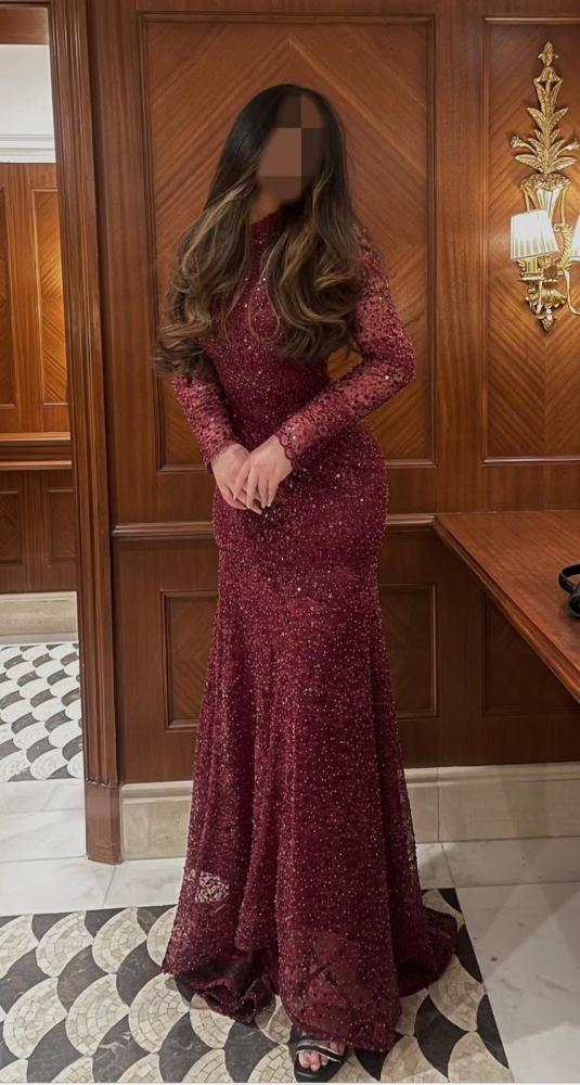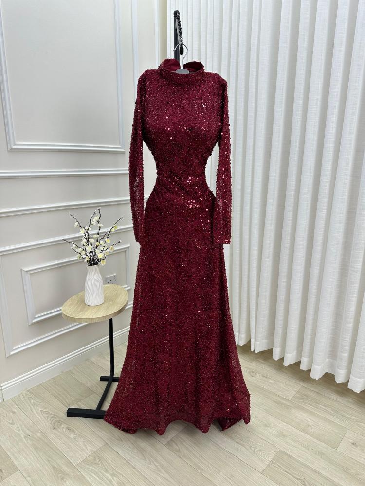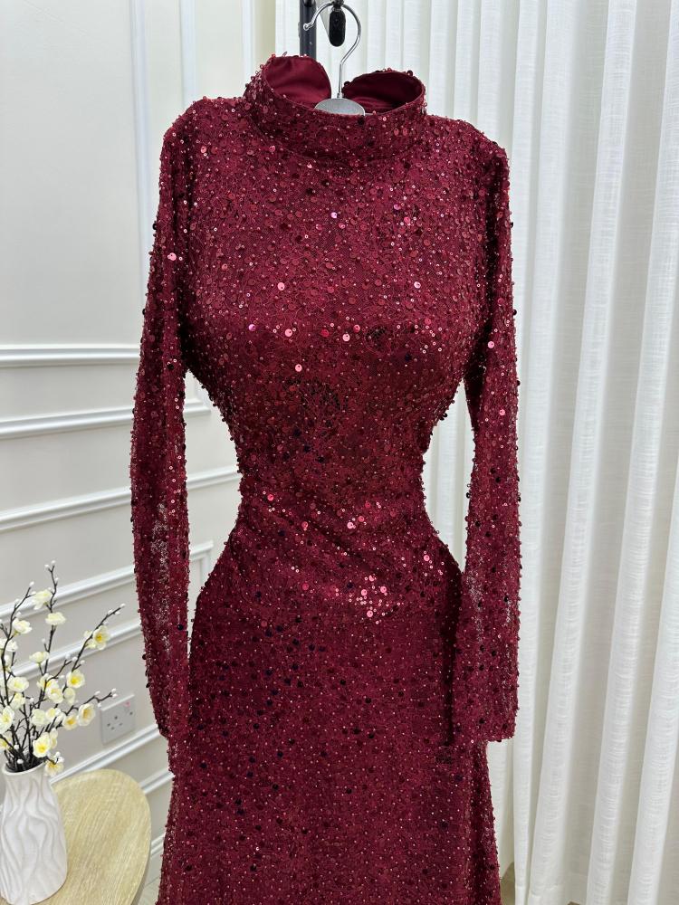 - فستان سهرة عنابي لامع، فساتين سهرة مطرزة، فساتين سواريه بالترتر، فستان طويل برقبة عالية، فساتين سهرة فخمة.