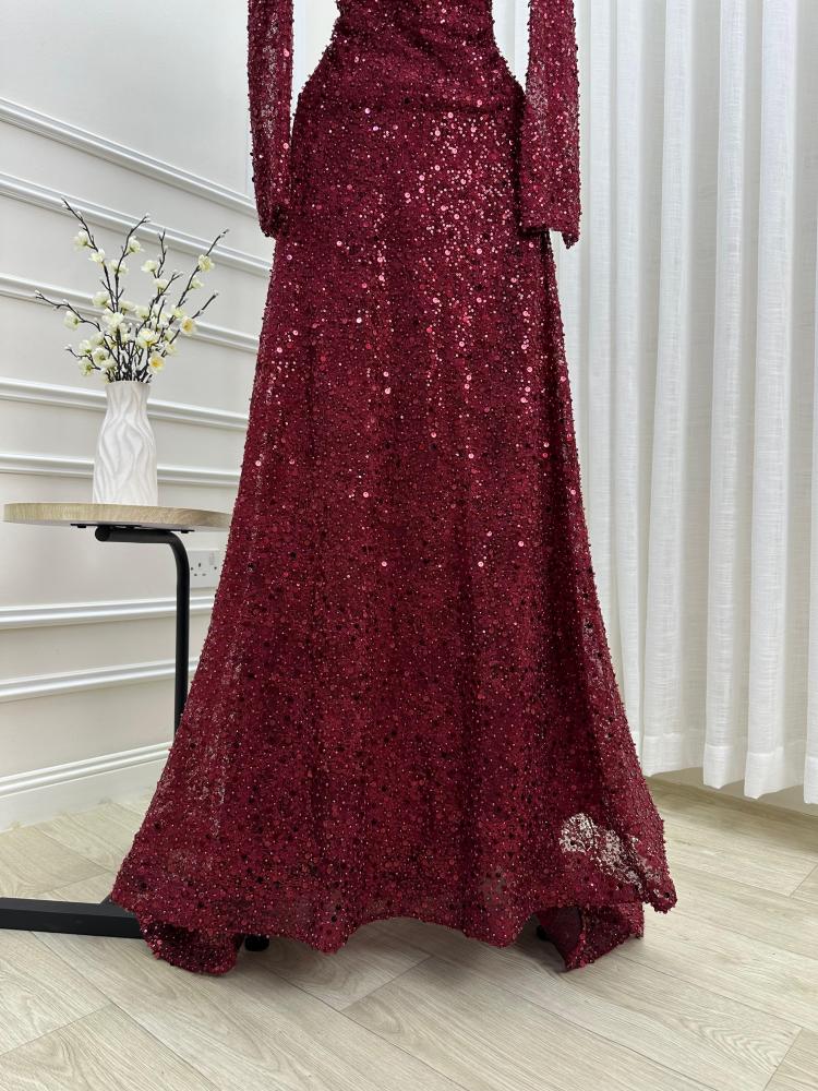 فستان سهرة عنابي لامع مطرز بالكامل بالترتر
