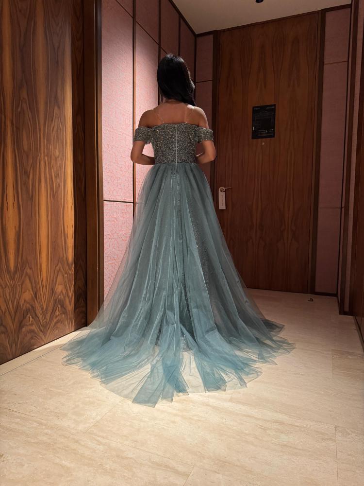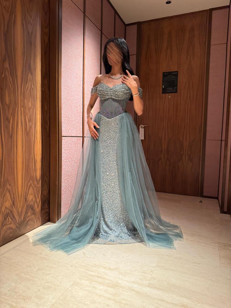 ✨ فستان سهرة ملكي بلون تيفاني مائل للأخضر بتفاصيل براقة ساحرة ✨