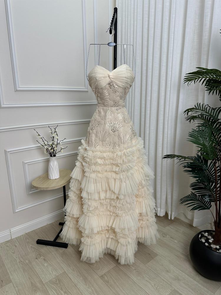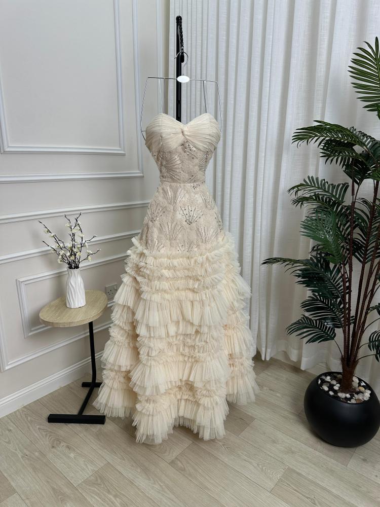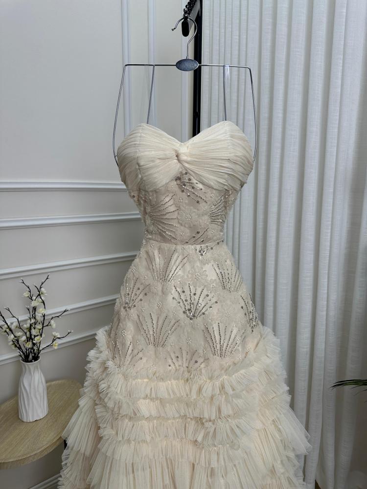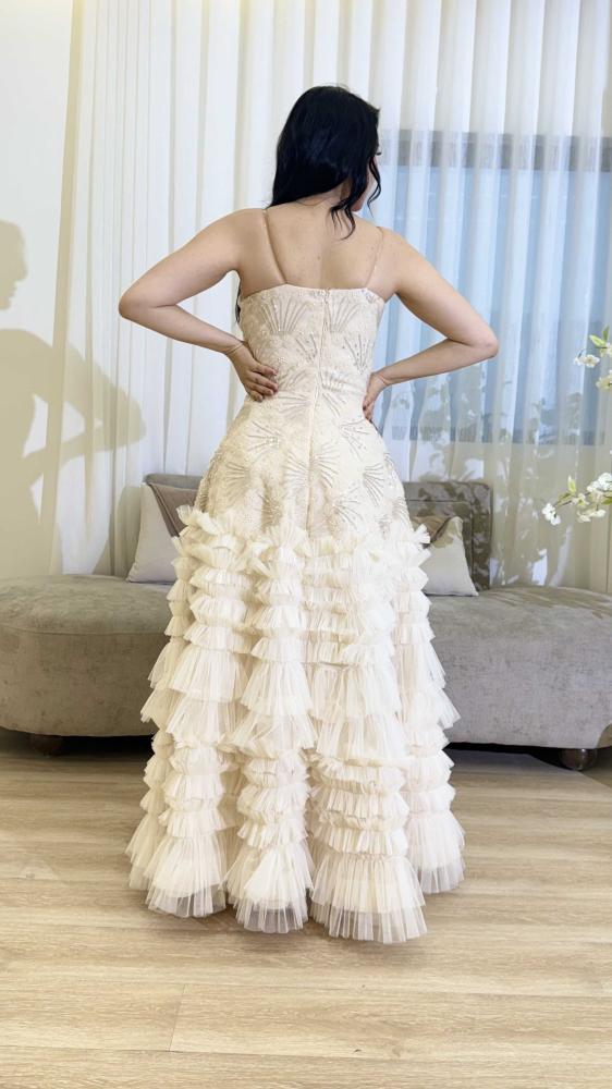 الوصف التفصيلي : تميّزي بإطلالة ناعمة وفخمة مع هذا الفستان بلونه العاجي الفاتح وتصميمه الملكي الراقي.