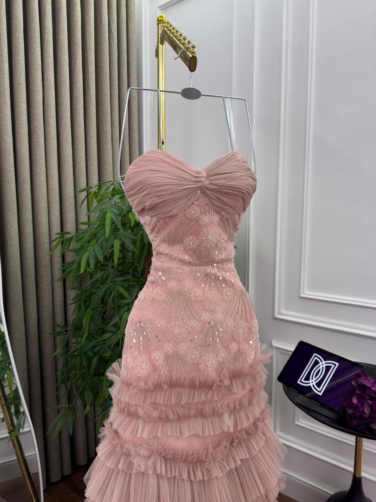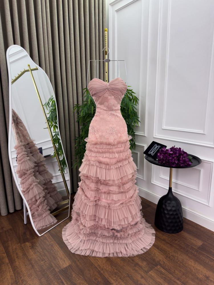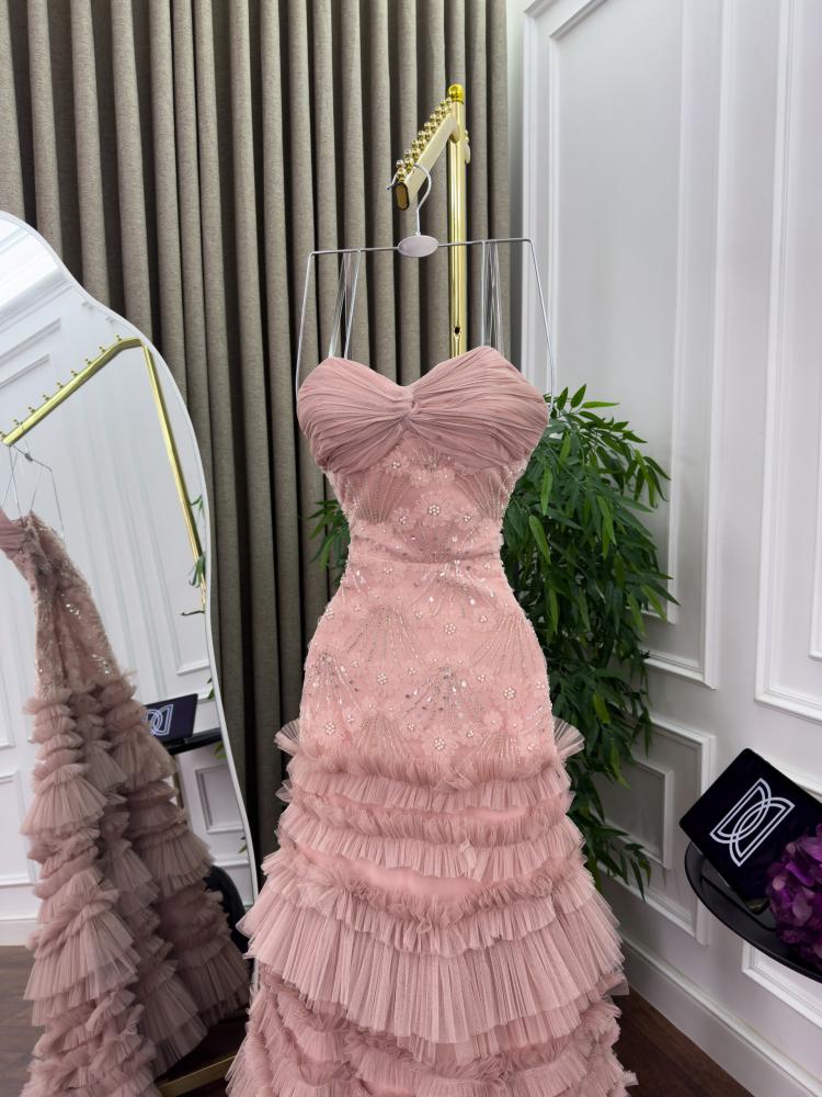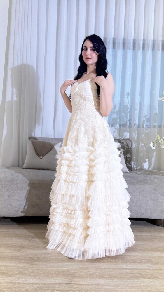 - القصة: ضيقة من الأعلى بتصميم صدر ملتف، ثم تتسع تدريجياً بكسرات من التول المنفوش لتعطي حركة ناعمة وملوكية