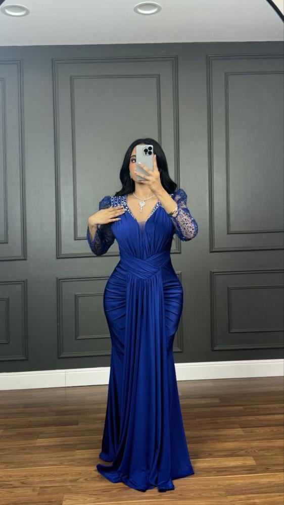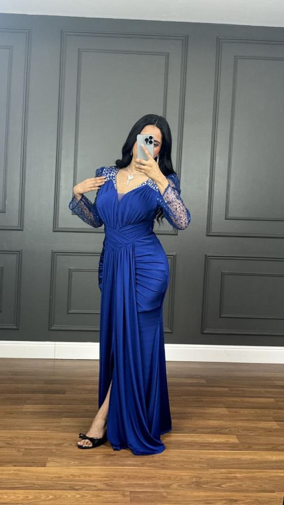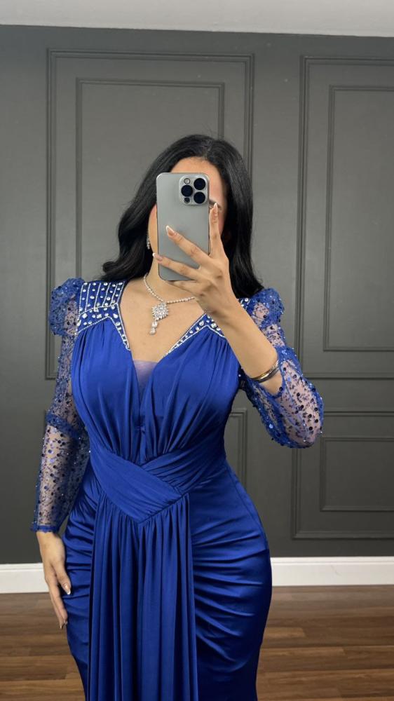 فستان سهرة فاخر بلونين أزرق ملكي جذاب واسود ملكي ، مصمم لإبراز الأنوثة والأناقة بلمسات راقية. يتميز بقصة ضيقة تبرز منحنيات الجسم، مع تصميم درابيه أنيق على منطقة الخصر لإضفاء لمسة انسيابية وجاذبية.