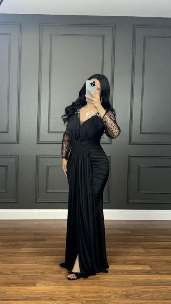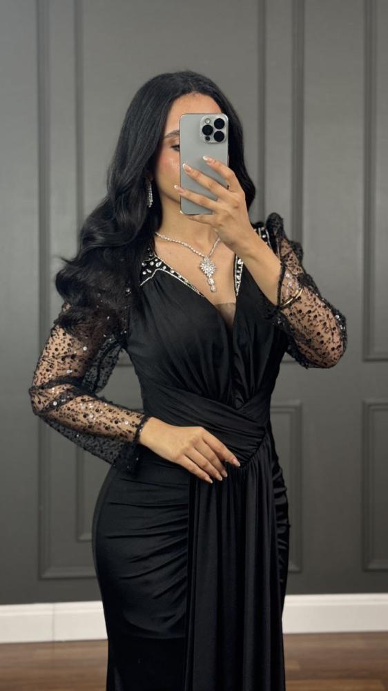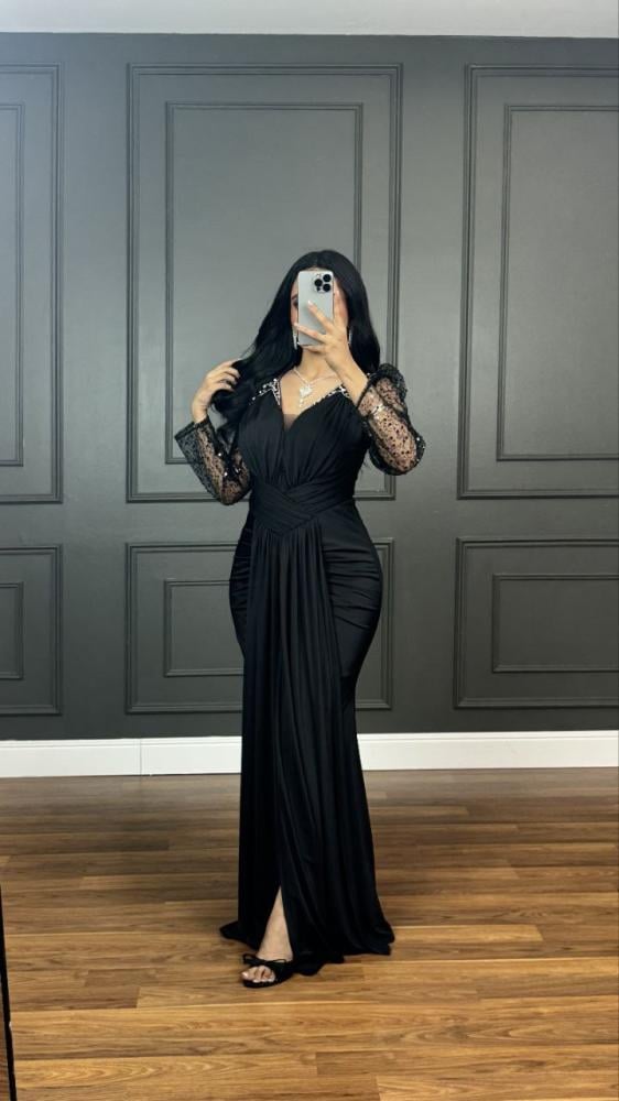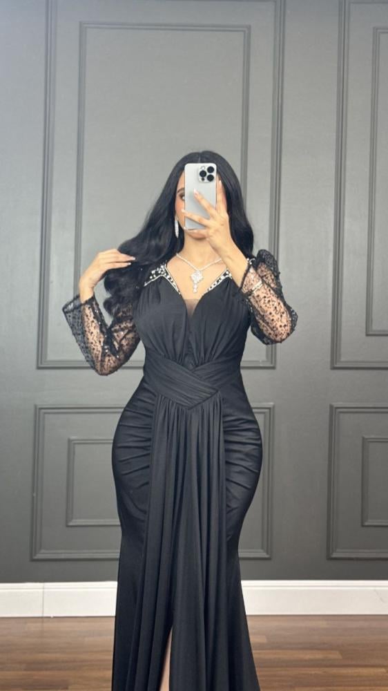 يأتي الفستان بأكمام طويلة شفافة من التول المطرز بالخرز اللامع، مما يضيف لمسة فاخرة ومميزة. أما الصدر فهو بتصميم مكشكش مع فتحة أنيقة تعزز من جاذبية الفستان.