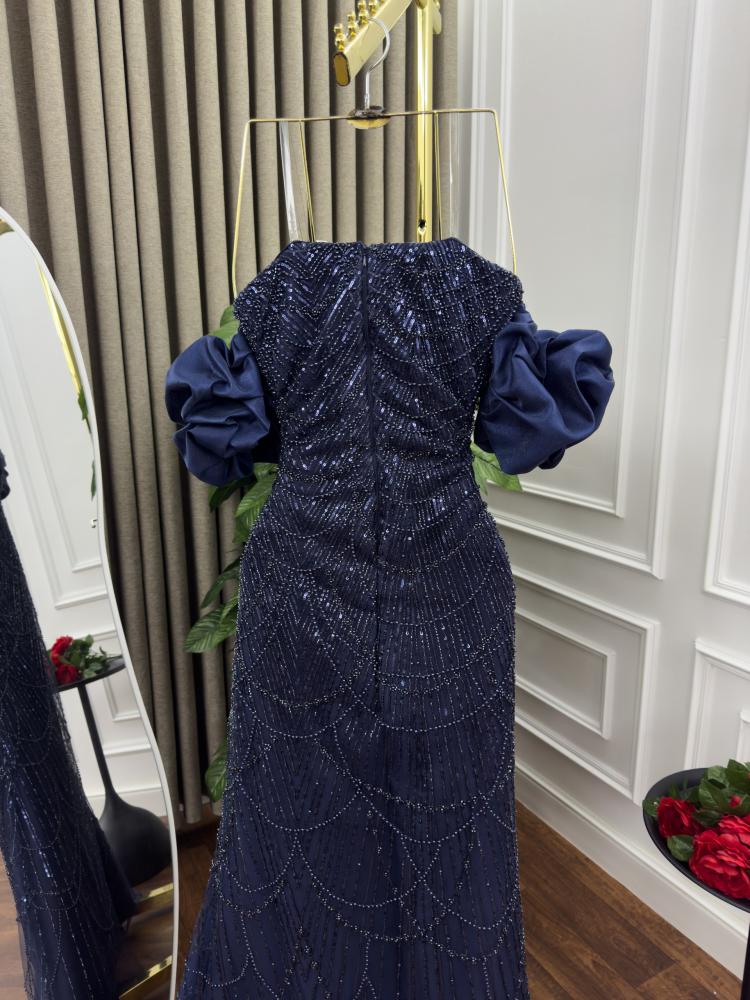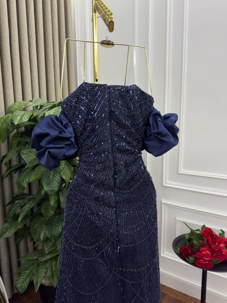 فستان كحلي فاخر مطرز بالأحجار والترتر.