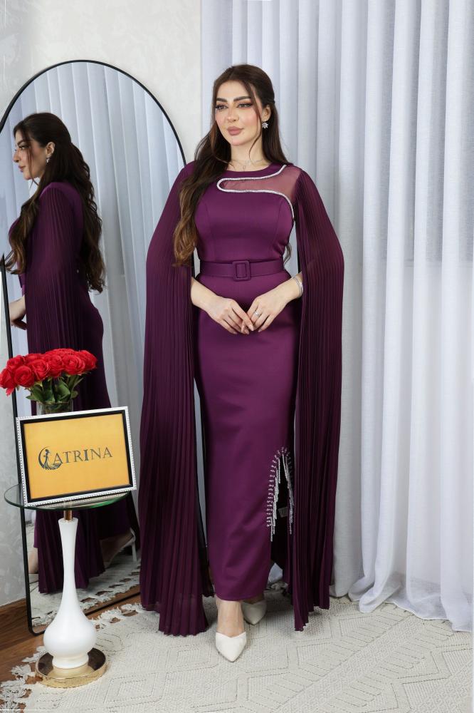 💜 فستان سهرة فاخر بتصميم كاب مطوي وتفاصيل براقة – أناقة ملكية بأسلوب عصري✨.