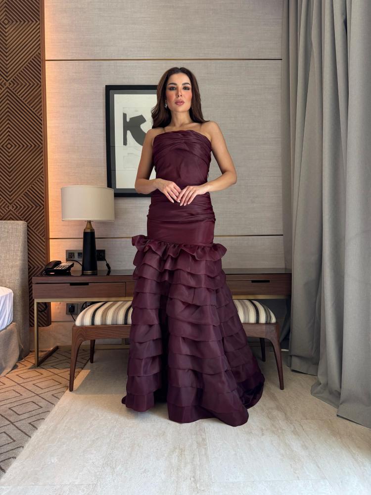 🍷 فستان سهرة ستايل ميرميد بلون نبيذي بطبقات كشكش – إطلالة درامية ملكية تخطف الأنفاس.