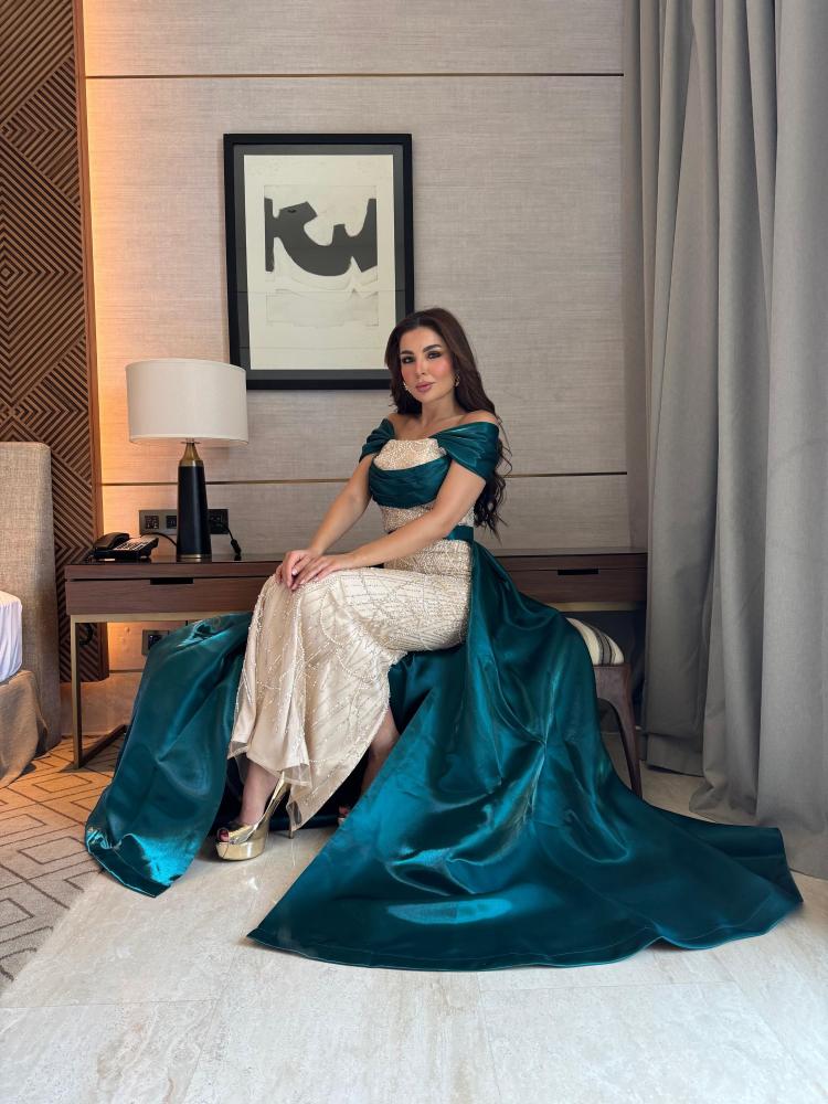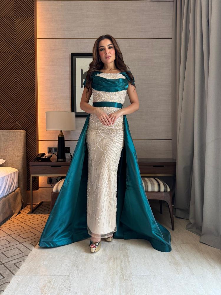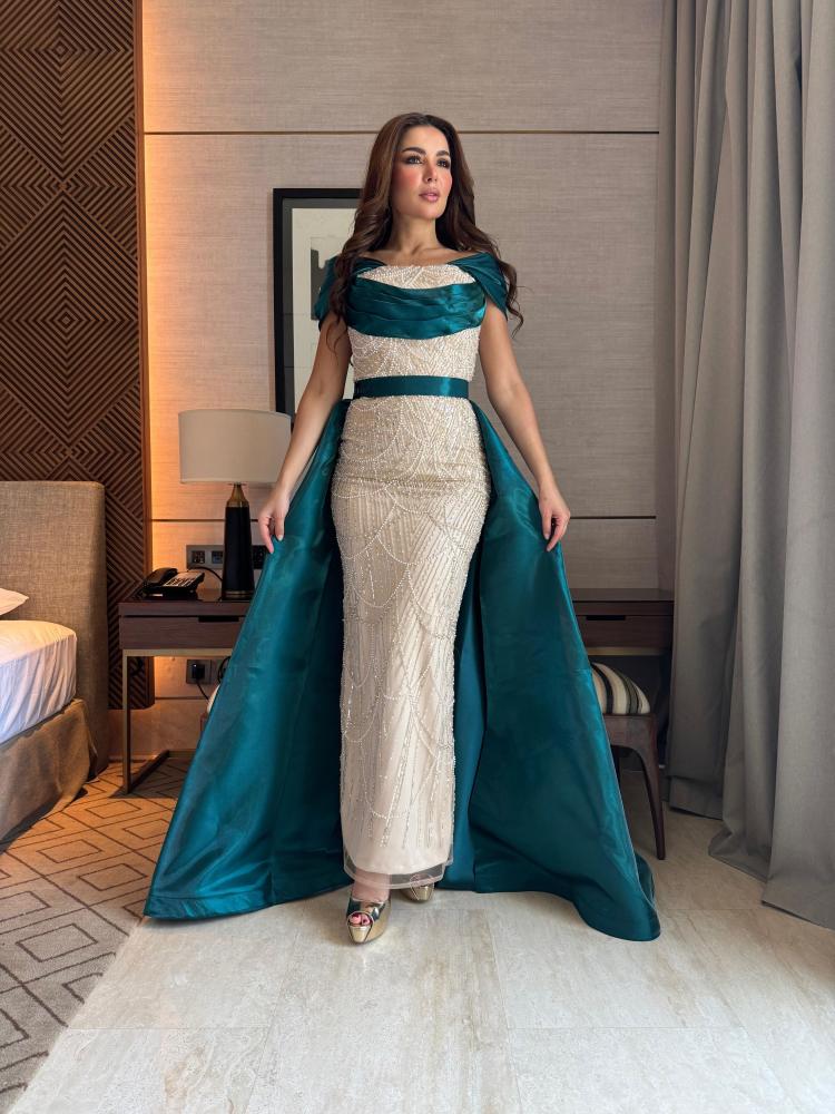 💎 فستان سهرة فاخر بلونين (عاجي وأخضر زمردي) مع تطريز يدوي وكاب ملكي – أناقة لا مثيل لها✨ إطلالة مبهرة تنطق بالفخامة والهيبة! هذا الفستان مصمم خصيصًا للمرأة التي تحب الظهور بأسلوب ملكي في مناسباتها الراقية. مزيج مثالي بين الأناقة الكلاسيكية واللمسات العصرية.