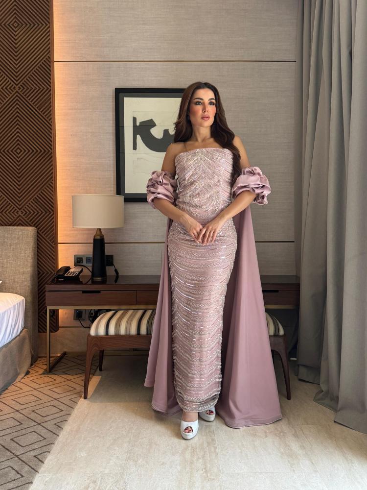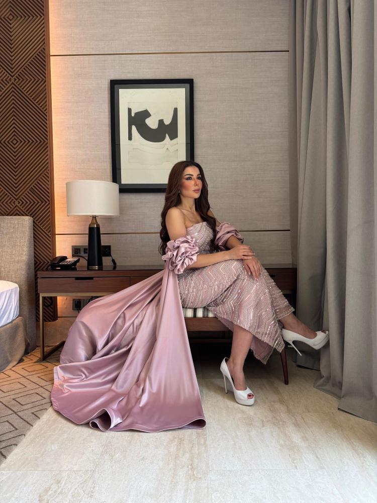 فستان سهرة مطرز وردي فاتح بتصميم أوف شولدر وكاب ملكي – فخامة تأسر العيون.