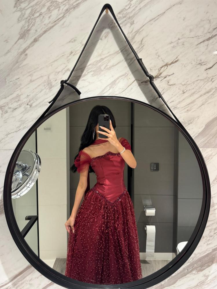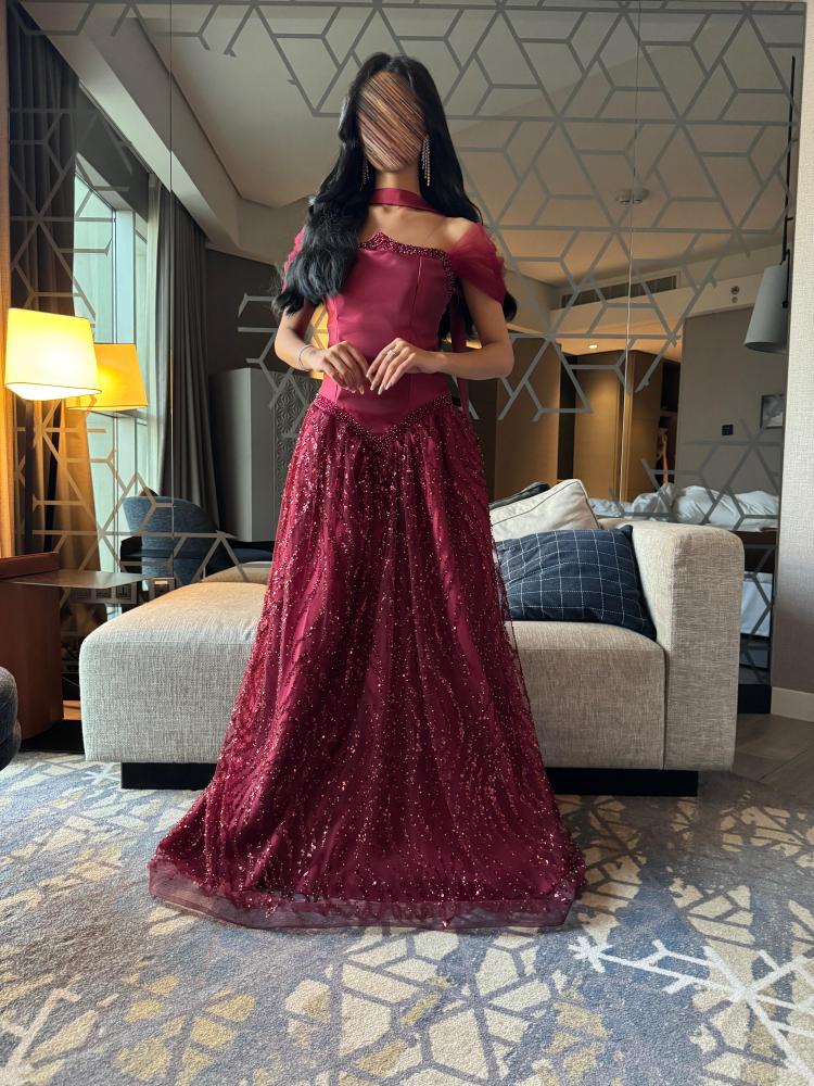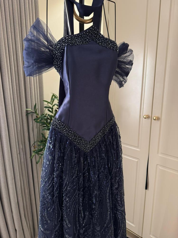 • القماش: تفتا ساتان فاخر في الجزء العلوي، وشبك مطرز بالخرز اللامع في التنورة