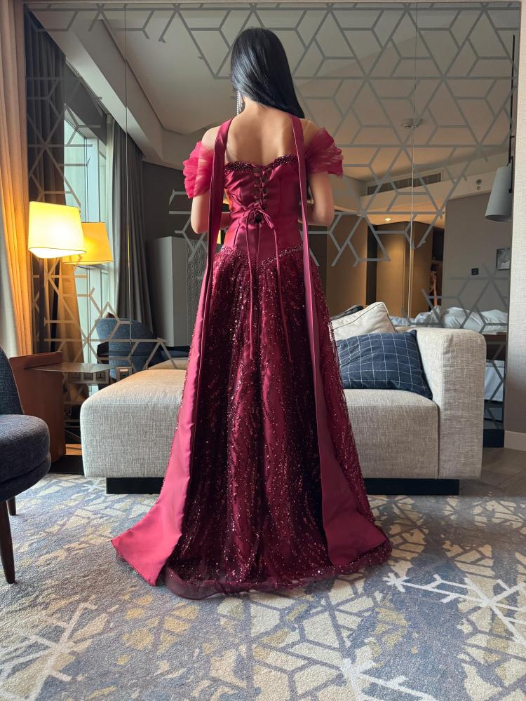 يتميز الفستان بجزء علوي بقصة كورسيه ناعمة، مع أكمام قصيرة من التول المنسدل تعطي لمسة أنثوية حالمة. أما التنورة فمصممة بتطريز فاخر من الخرز اللامع الذي يغمر القماش بالكامل بتفاصيل أنيقة وناعمة.