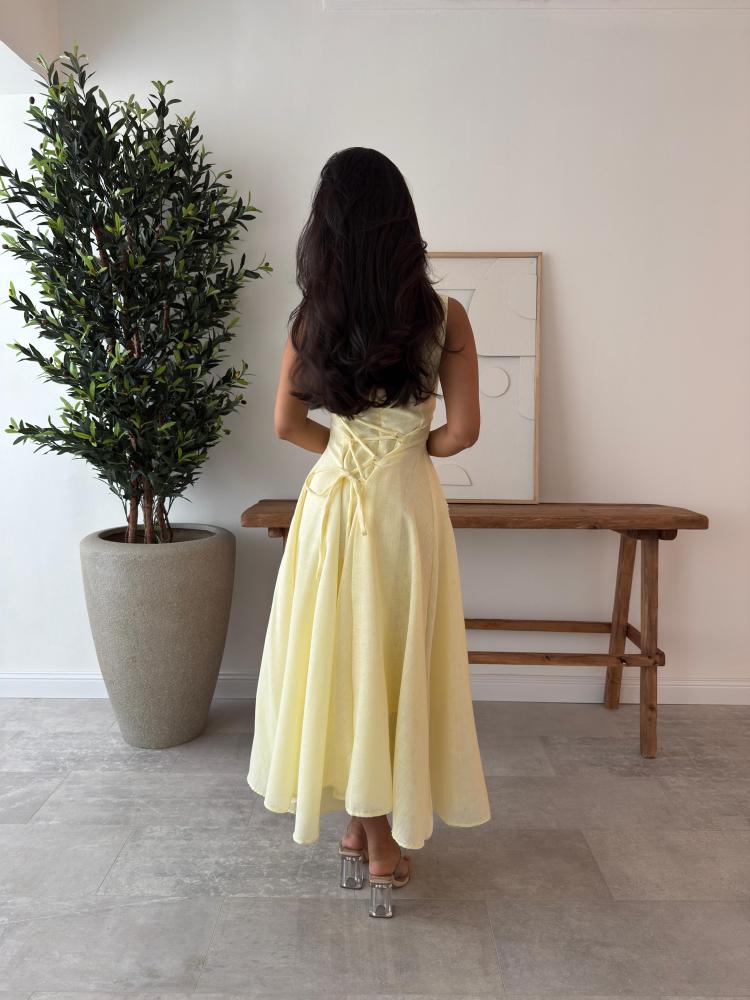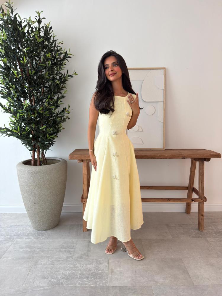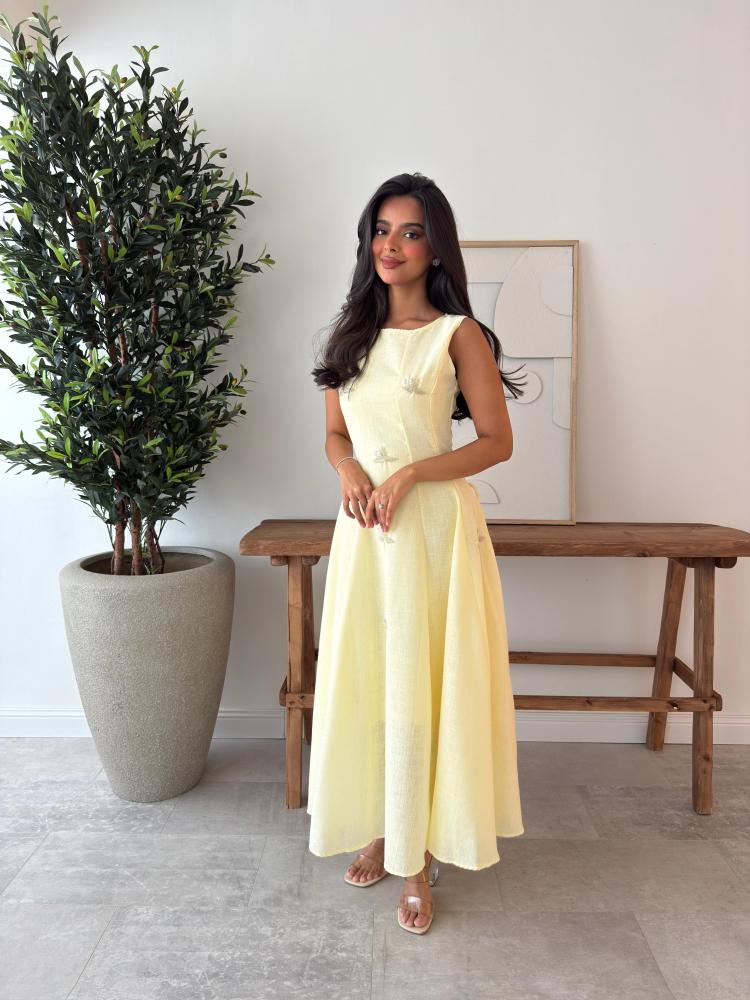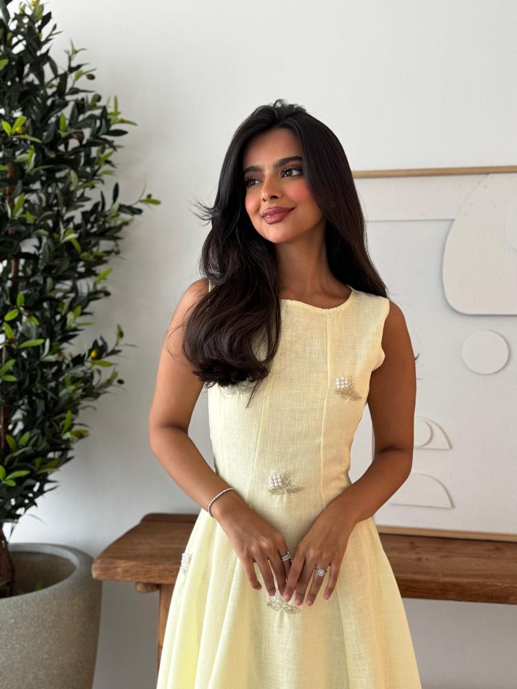 تميّزي بإطلالة أنثوية منعشة بهذا الفستان الليموني الفاتح المصمم بقماش خفيف وناعم بقصّة A-Line مريحة وانسيابية.