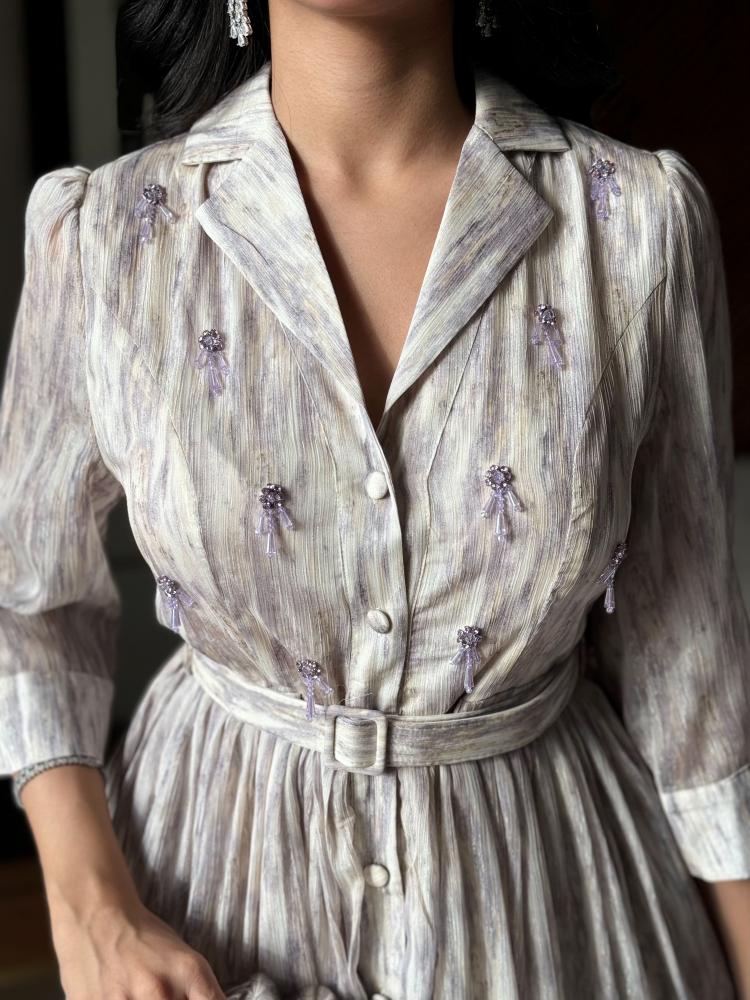 فستان مشجر بتطريز كريستال بحزام . مصنوع بخامة شيفون الفاخرة التي تضفي لمسة من الاناقه على إطلالتك. يتميز الفستان بتصميم عصري راقٍ يجمع بين الفخامه والتفاصيل المميزة، حيث يغطيه تطريز دقيق وفاخر من الكريستال يزيد من جمال الفستان.