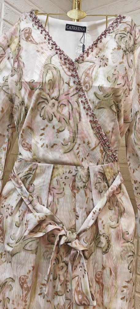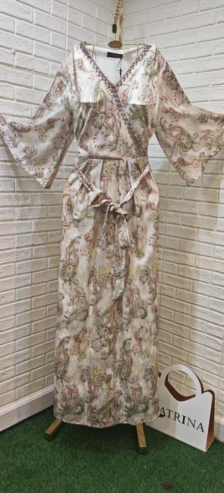 فستان مشجر مزين بكريستال أنيق بنقشه عشوائية, مصنوع من قماش الستان الناعم، مما يمنحه لمسة خفيفة وراقية. يتميز الفستان بتصميمه المنفوش والمزين بتطريزات من الرقبه الى الصدر متناثرة على القماش، مما يضفي عليه لمسة رقيقة وأنثوية.
