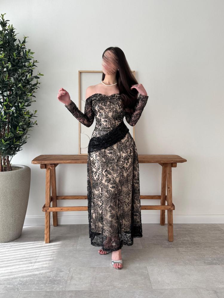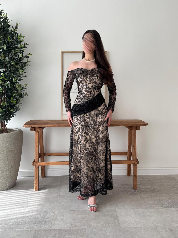 يتميّز بقصّة أوف شولدر (Off Shoulder) تُبرز الأكتاف برقيّ، مع أكمام طويلة شفافة تمنح لمسة من الغموض والجاذبية.