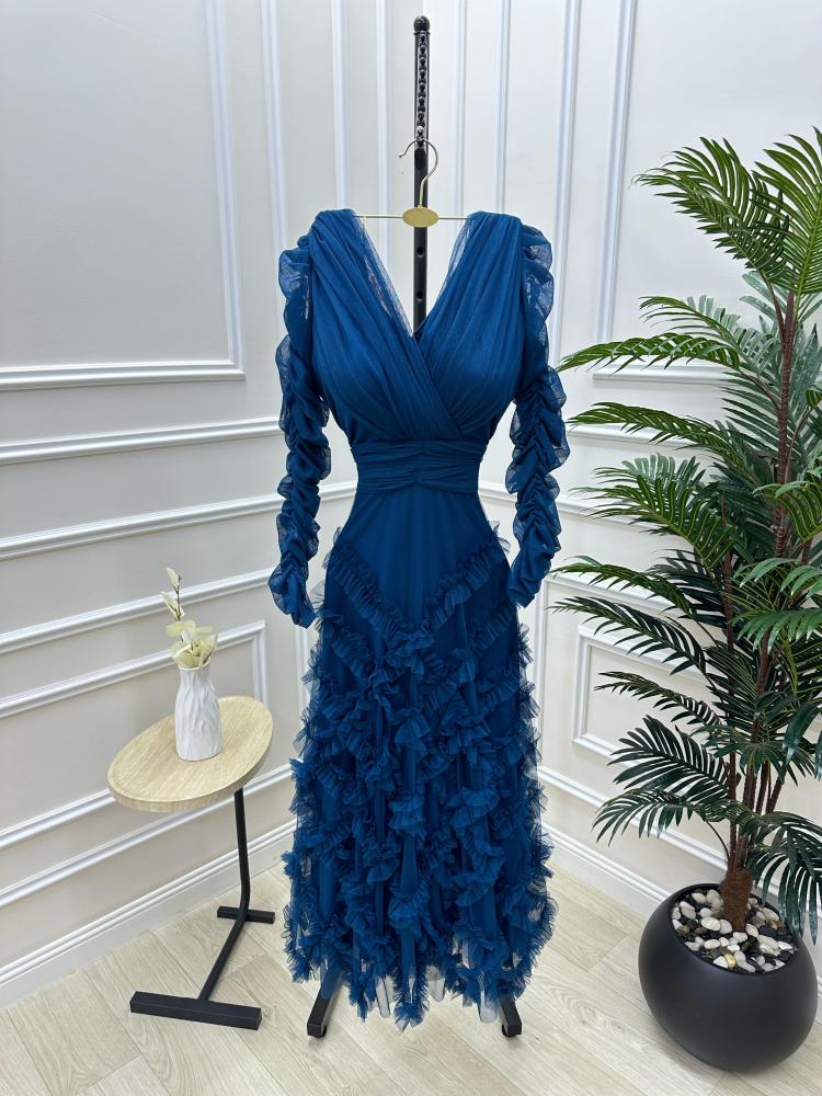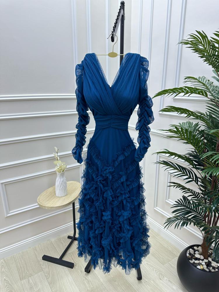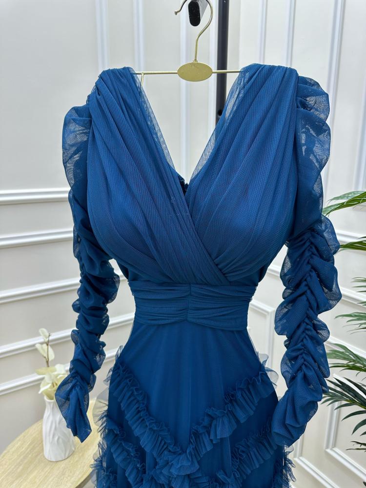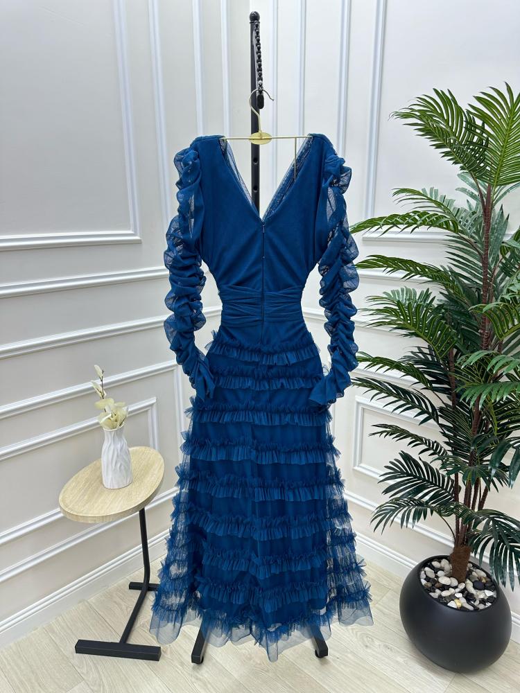 فستان سهرة أزرق ملكي بتصميم كسرات وتفاصيل كشكش